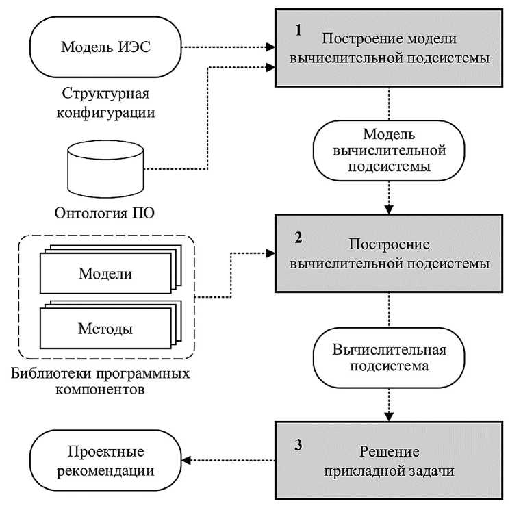 Данный этап предполагает решение прикладных задач. В ходе этого процесса происходит интеграция методов и моделей элементов ИЭС. Схема взаимодействия программных компонентов при автоматизированном построении вычислительной подсистемы цифрового двойника в соответствии с предлагаемой методикой приведена на рис. 5.