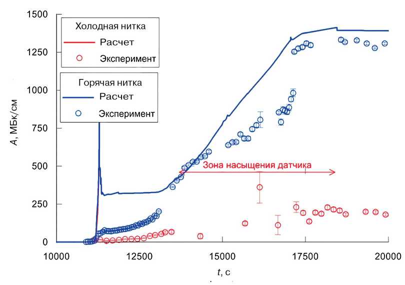 Результаты расчета переноса и осаждения изотопов РВ демонстрируют хорошее согласие с экспериментом. В частности, на рис. 4 показана временная зависимость линейной плотности активности (МБк/см) изотопа 137Cs в горячей и холодной нитках установки (в точках расположения детекторов). Датчики показывают суммарную взвешенную и осажденную активность. Расчетные величины активности цезия в горячей нитке качественно верно показывают наличие повторного взвешивания и перенос содержащих цезий молекул из пространства над сборкой в парогенератор. В работе [10] отмечается, что цезий в горячей нитке присутствовал в основном в форме CsOH, что учитывалось при моделировании.