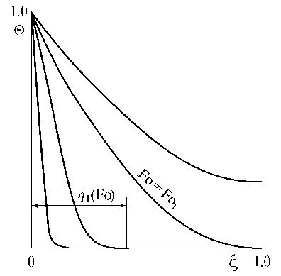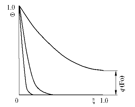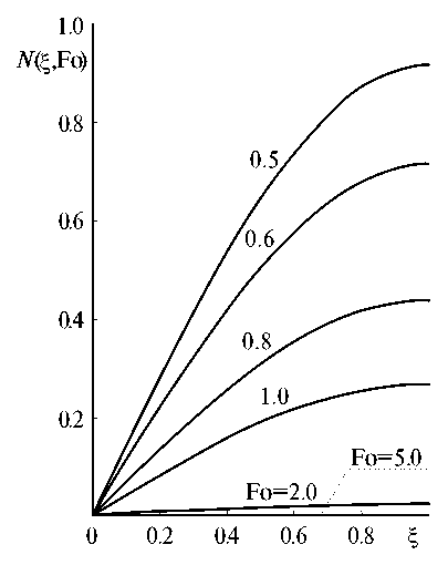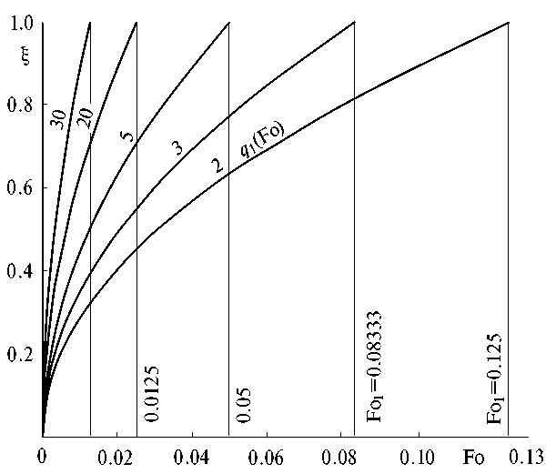 где – безразмерная температура; – число Фурье; – безразмерная координата; x – координата; – толщина пластины; a – коэффициент температуропроводности; – время; – начальная температура; – температура стенки.