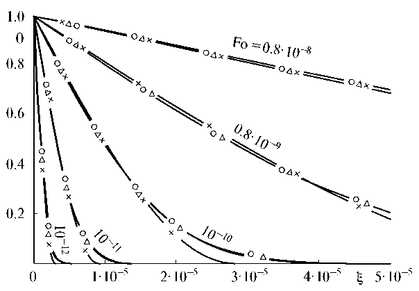 Анализ результатов расчетов для 2, 3, 5, 20, 30-го приближений в сопоставлении с точным решением [2] позволяет заключить, что с увеличением числа приближений решение уточняется, приближаясь к точному. Так уже в 20-ом приближении отличие от точного решения не превышает , а в 30-ом – практически совпадает с ним. Результаты расчетов для сверхмалых величин времени () даны на рис. 7. Следует подчеркнуть трудности нахождения точного решения по формулам из [2] для столь малых величин Фурье из-за необходимости применения большого числа членов ряда. Расчеты показывают, что при для обеспечения сходимости точного решения следует использовать 2000 членов ряда (формула (1.16), на стр. 87 из [2]). Для чисел ; ; ; ; сходимость точного решения наступает, соответственно, при следующих числах членов ряда: ; ; ; ; .