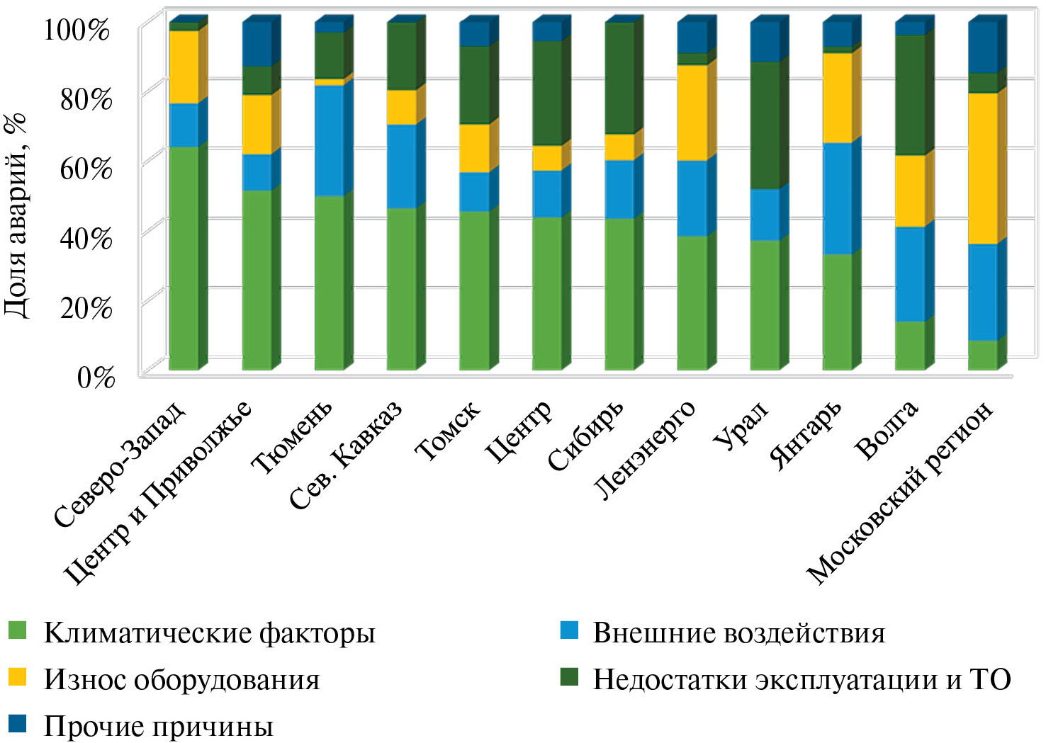 Рис. 1. Вклад основных причин в аварийность на объектах напряжением 6 кВ и выше в различных филиалах ПАО “Россети”.