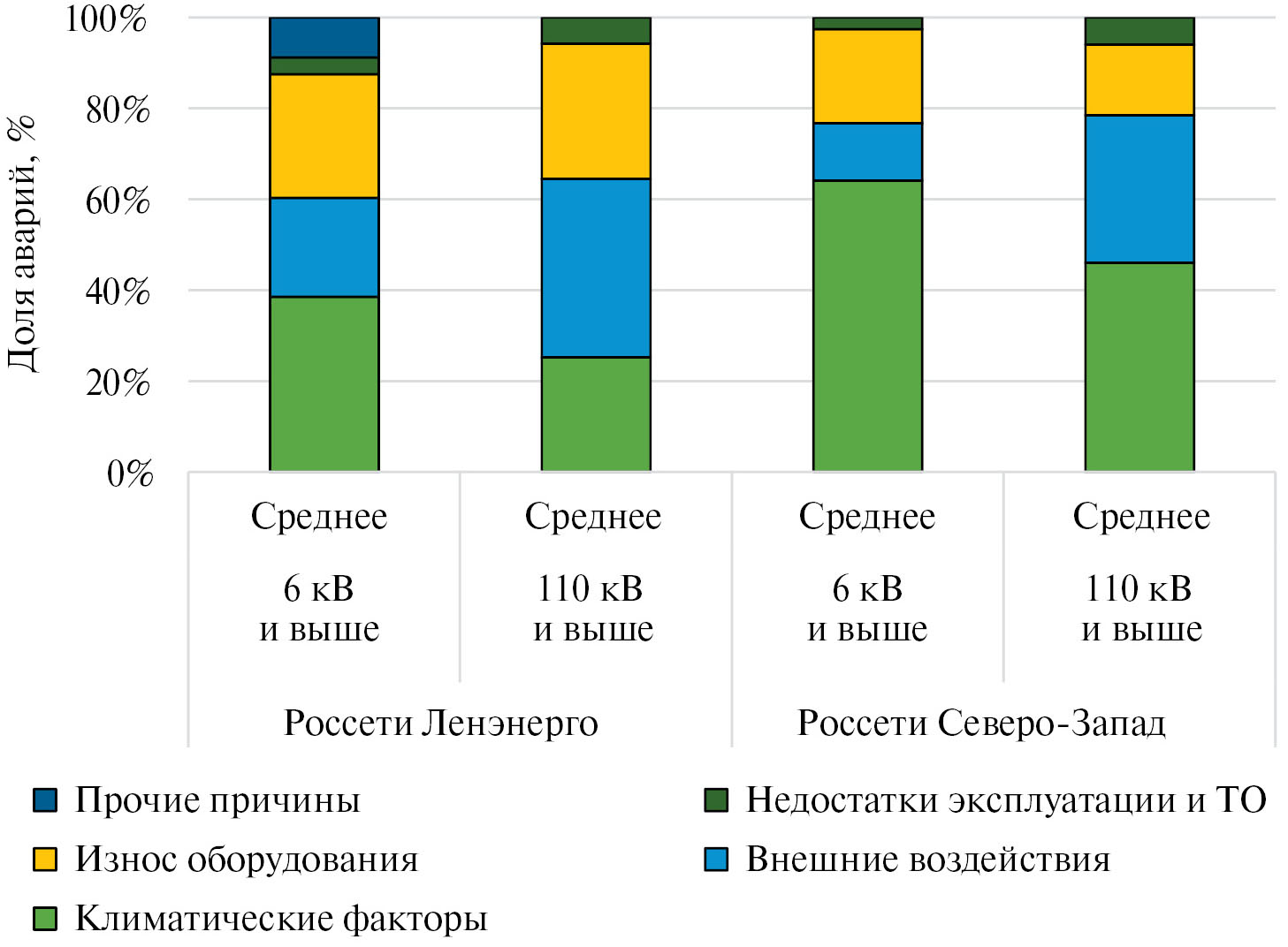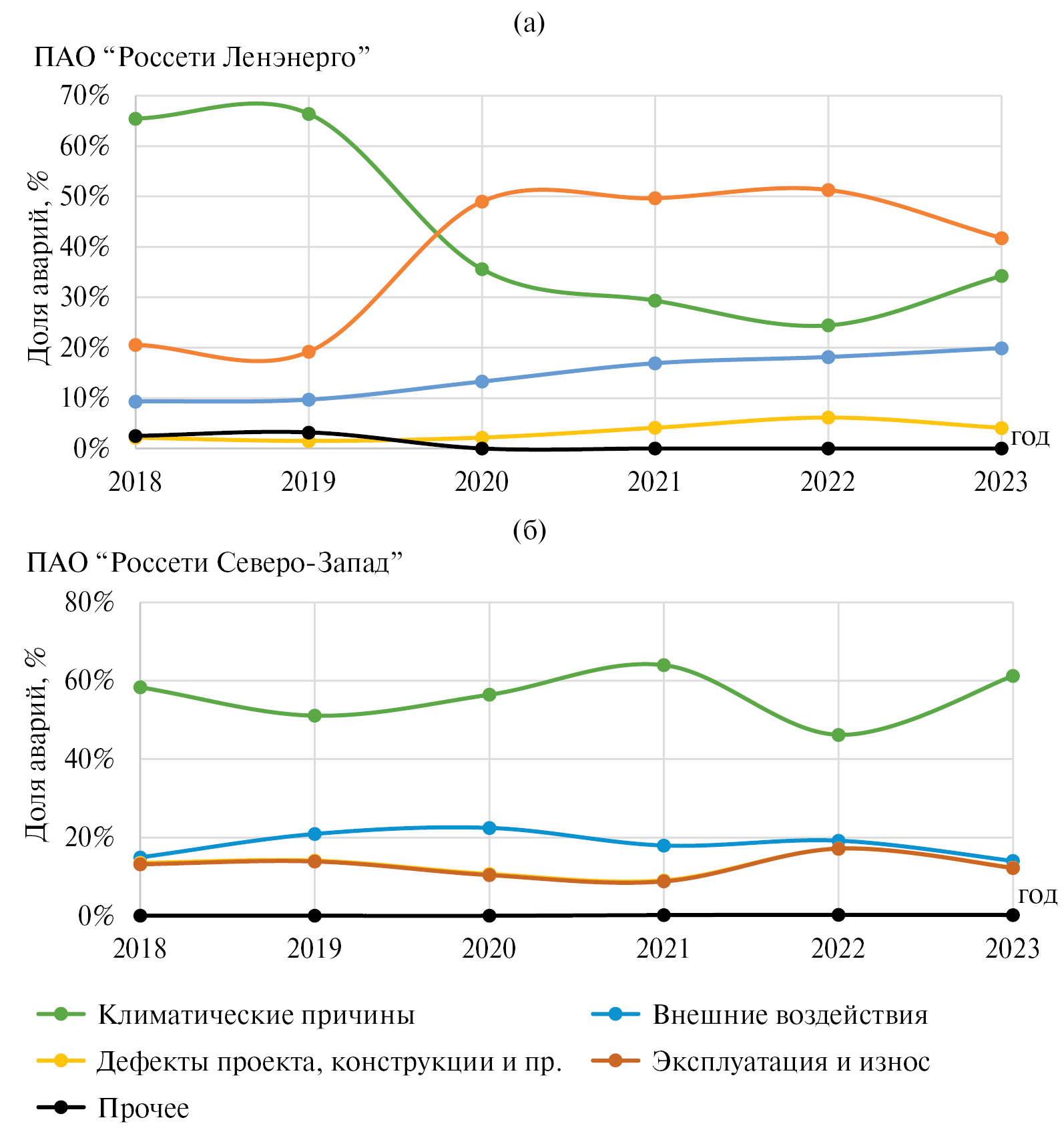 Данные из годовых отчетов ПАО “Россети Ленэнерго” содержат информацию о причинах аварийных отключений за период с 2013 по 2022 гг., причем отчеты, опубликованные до 2018 г. включительно, содержат сведения об отключениях в сетях 6 кВ и выше, а в период 2019–2022 г. предоставляются данные об отключениях только в сетях 110 кВ и выше. Отчеты ПАО “Россети Северо-Запад” содержат информацию о причинах аварийных отключений за период с 2009 г. по настоящее время. Однако отчеты ранее 2015 г. не дают объективной картины для оценки причин отключений в силу того, что данные приведены лишь для трех причин: климатические, внешние воздействия и недостатки эксплуатации, которые по предоставляемым данным занимают менее 50% отключений.