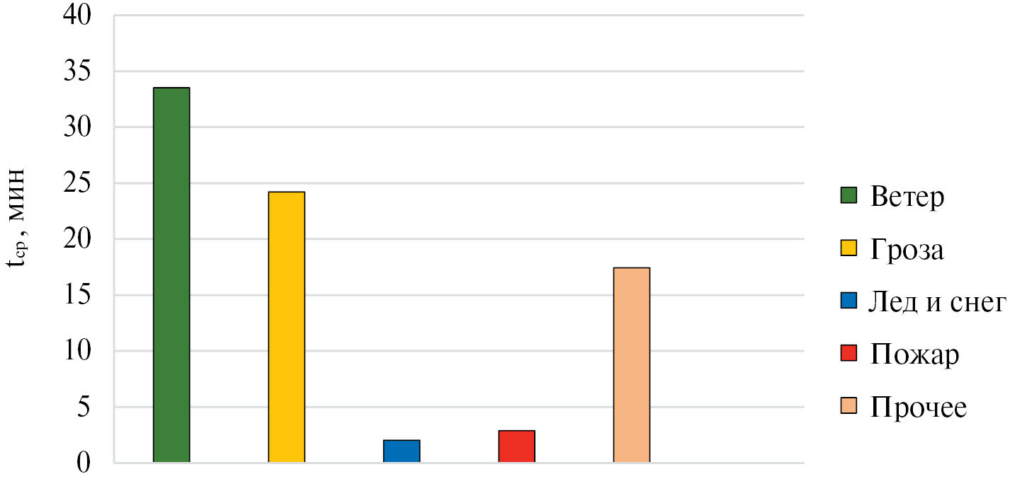 Рис. 5. Средняя продолжительность (tср) отключений, вызванных различными климатическими факторами, мин.
