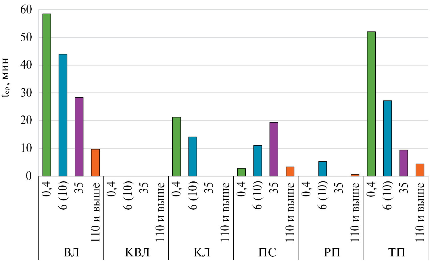 Рис. 6. Средняя продолжительность отключений оборудования разного класса напряжения в рассматриваемых сетях, мин. ВЛ – воздушная линия; КВЛ – кабельно-воздушная линия; КЛ – кабельная линия; ПС – подстанция; РП – распределительная подстанция; ТП – трансформаторная подстанция.
