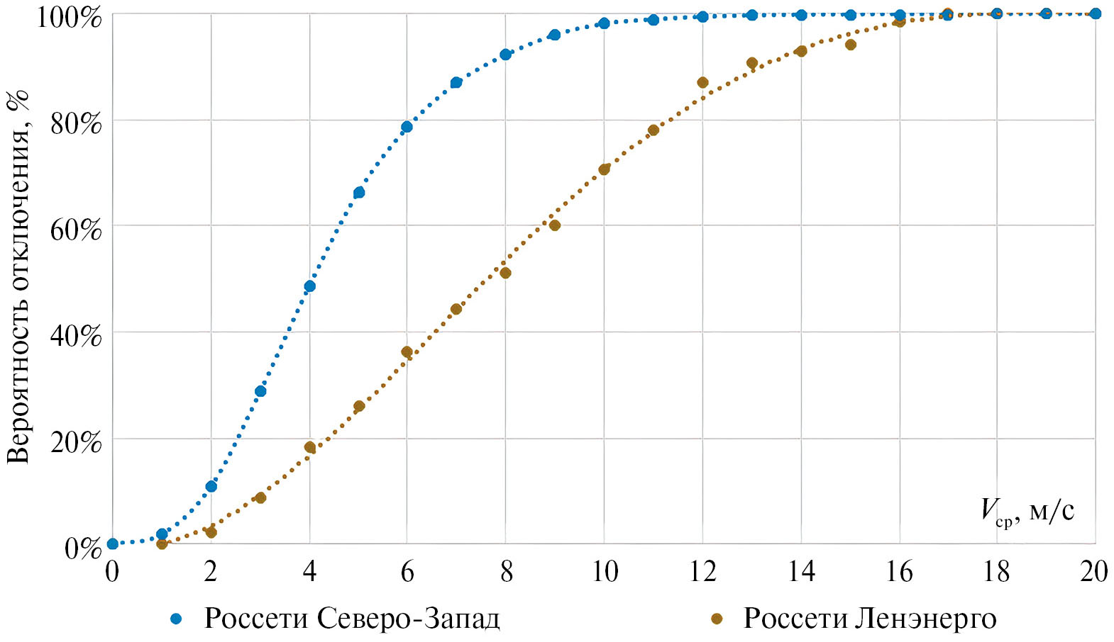 Согласно полученным зависимостям, можно утверждать, что на территории ПАО “Россети Ленэнерго” отключения, связанные с воздействием ветровых нагрузок при скорости ветра выше 16 м/с, произойдут с вероятностью почти 100%, а на территории ПАО “Россети Северо-Запад” при скорости 10 м/с и более.