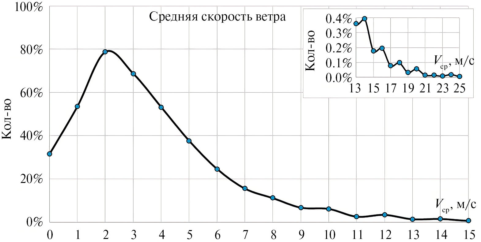 На рис. 9 представлена встречаемость различных скоростей ветра на рассматриваемой территории за весь период наблюдений. По полученным данным 50% всех зафиксированных скоростей ветра находятся в пределах от 1 до 4 м/с.
