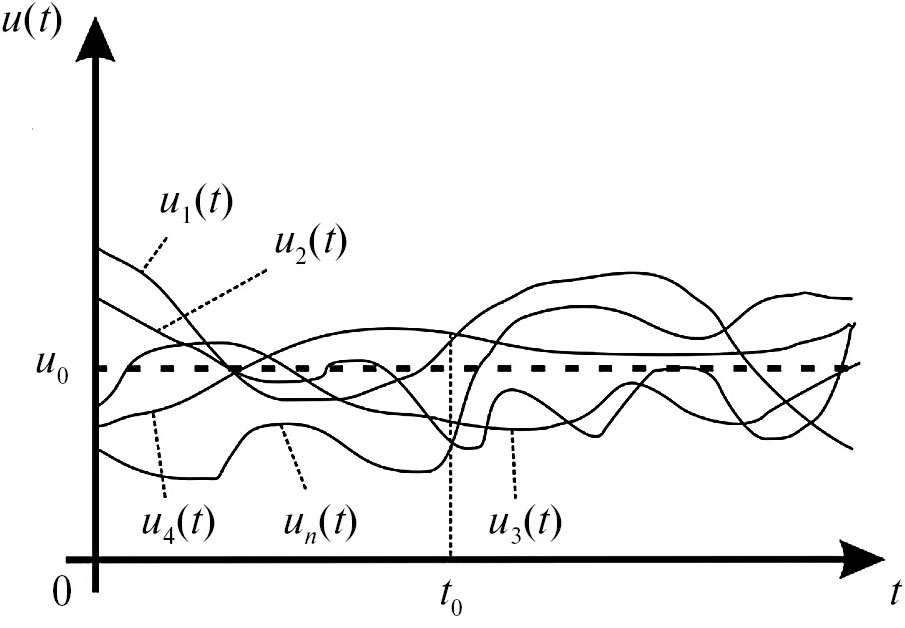 В составе ЭЭС работают различные элементы с различными особенностями работы. По сути, случайный процесс функционирования ЭЭС является процессом с непрерывным временем и с непрерывными состояниями (по факту состояния являются смешанные, так как присутствуют и непрерывные, и дискретные, в теории случайных процессов такие состояния тоже называются непрерывными). Непрерывное время объясняется тем, что для ЭЭС переходы системы из состояния в другие состояния могут происходить в любой момент t наблюдаемого периода T, но в процессе оценки надежности ЭЭС на основе метода Монте-Карло рассматриваемые периоды дискретны и равны какому-либо временному промежутку, как правило одну часу. Что касается случайных состояний, то, как уже отмечено, рассматриваются различные состояния как дискретные, так и непрерывные, например, отказы энергетического оборудования формируют дискретные состояния, а случайное поведение параметра ЭЭС, например, напряжение и параметра, влияющего на надежность ЭЭС, например, скорость ветра или инсоляция солнца формируют непрерывные состояния. Если углубиться в анализ случайного процесса функционирования ЭЭС, то можно заключить, что функционирование ЭЭС характеризуется множеством случайных процессов, которые связаны электротехническими и другими законами. При многократном моделирования динамики изменении параметров ЭЭС получим семейство реализаций случайного процесса. При анализе надежности ЭЭС требуется определить изменение параметров системы при реализации случайных событий. К примеру, траектория изменения напряжения на шинах подстанции, в течение определенного времени представляет случайный процесс, т.к. значение напряжения зависит от многих факторов: отказы оборудования, нагрузка потребителей, внешние погодные условия и др. В случае критического снижения напряжения, могут произойти неблагоприятные события в ЭЭС, например, такие как: повреждение асинхронных электродвигателей или отключение части потребителей от снабжения электроэнергией автоматическими устройствами. Для любого фиксированного момента напряжение представляет собой случайную величину . Результатом опытов является семейство траекторий изменения напряжения показанное на рис. 1. В момент времени формируется сечение случайного процесса , напряжение в этот момент является случайной величиной, значение случайной величины для каждой траектории будут следующие: