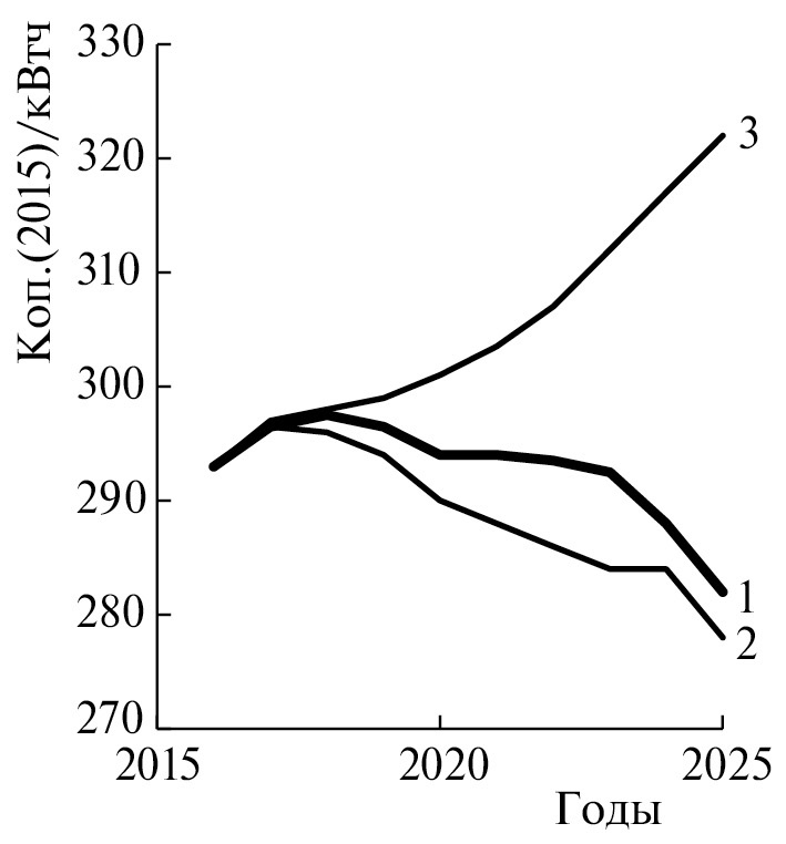 Двухэтапный подход к оценке (с помощью финансово-экономических моделей) ценовых последствий реализации тех или иных вариантов развития электроэнергетики разработан и используется в ИНЭИ РАН [11]. На первом этапе для каждого варианта определяются параметры производственных и инвестиционных программ, а на втором – необходимая для их реализации валовая выручка (НВВ). Среднеотпускная цена электроэнергии для различных потребителей ЕЭС России рассчитывается как отношение полной НВВ к полезному отпуску электроэнергии конечным потребителям. Расчеты, выполненные этим способом в 2018 году [12], показали, что в период 2016–2025 гг. темпы роста среднегодовой цены электроэнергии в ЕЭС снижаются в базовом и консервативном вариантах соответственно на 0.4% и 0.6%, но в целевом варианте (чтобы избежать дефицита мощностей) должны увеличиться на 1.1%. При этом диапазон неопределенности цены в 2025 г. составит 15%.