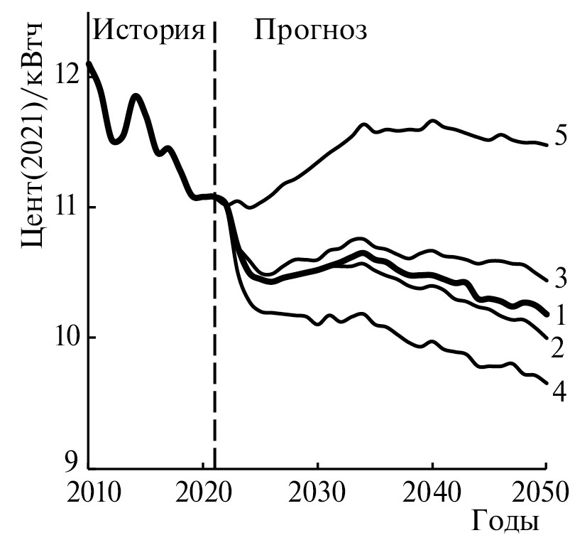Примечание: Результаты расчетов на модельном комплексе NEMS пяти сценариев: 1 – базовый сценарий, 2 и 3 – низкая и высокая стоимость ВИЭ, 4 и 5 – низкие и высокие цены на нефть и газ. Стоимость электроэнергии включает ее генерацию, магистральный транспорт и распределение. Источник: [6].
