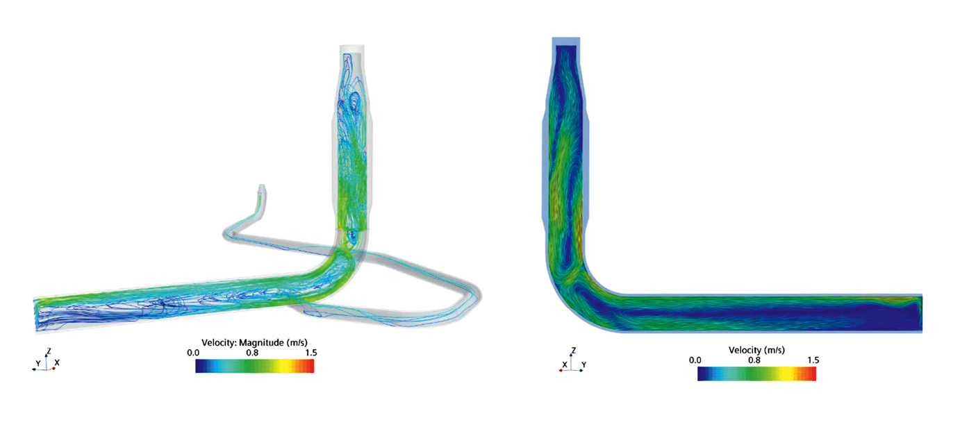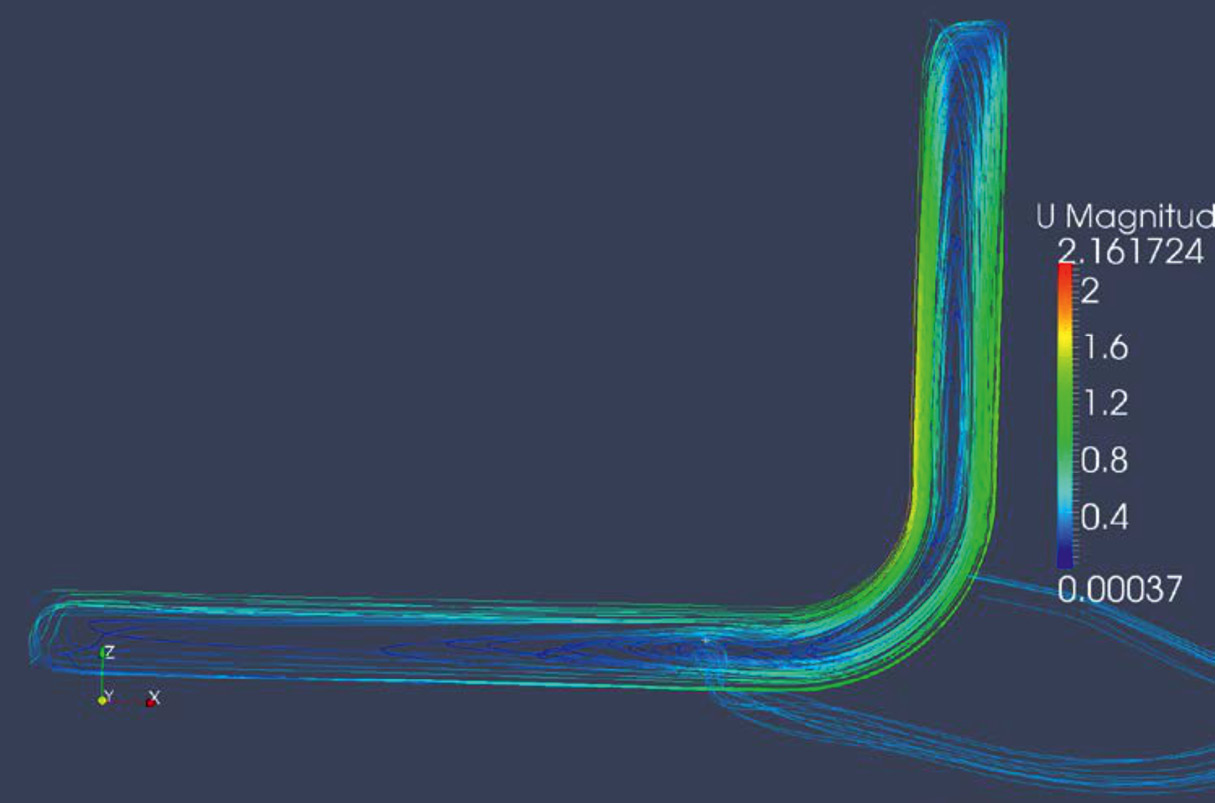 С использованием упрощенной модели при помощи OpenFOAM был выполнен базовый расчет с расходом перегретого пара на входе в модель 1 кг/с и дополнительный расчет с расходом 2 кг/с. В результате была получена квазистационарная картина конвективного течения в горячей нитке и коллекторе ПГ, качественно соответствующая результатам для аналогичной области РУ PWR (рис. 5). Согласно полученным результатам, перегретая среда из а.з. поступает в горячий коллектор ПГ по верхней части горячей нитки, частично охлаждается и по нижней части горячей нитки возвращается к выходному патрубку реактора, где подмешивается к поступающей перегретой среде. В окрестности соединительного трубопровода наблюдается перемешивание прямого и обратного токов среды.