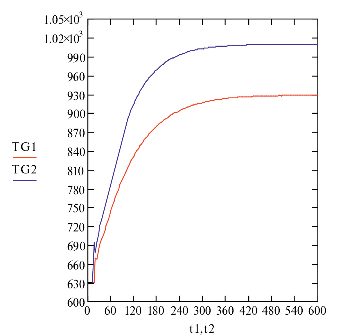 На рис. 6 показаны зависимости температуры среды от времени в точке, расположенной в центре горячего коллектора. В расчете с расходом подачи 1 кг/с стационарное значение температуры составило 929 К, а при расходе 2 кг/с температура выросла до 1010 К.