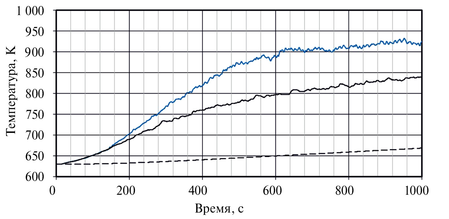 Таким образом, в результате проведенных расчетов показано, что с учетом времени между закрытием и открытием ИПУ КД 300–400 с описание перегретого пара как идеального газа в данной задаче недопустимо, а учет теплообмена со стенками снижает максимальную температуру пара в горячем коллекторе на 50−100 К. На фазе закрытого ИПУ КД стационарная конвекция между а.з. и горячим коллектором установиться не успевает, а максимальная температура пара в центре коллектора с учетом осцилляций не превышает 1000 К (рис. 14).
