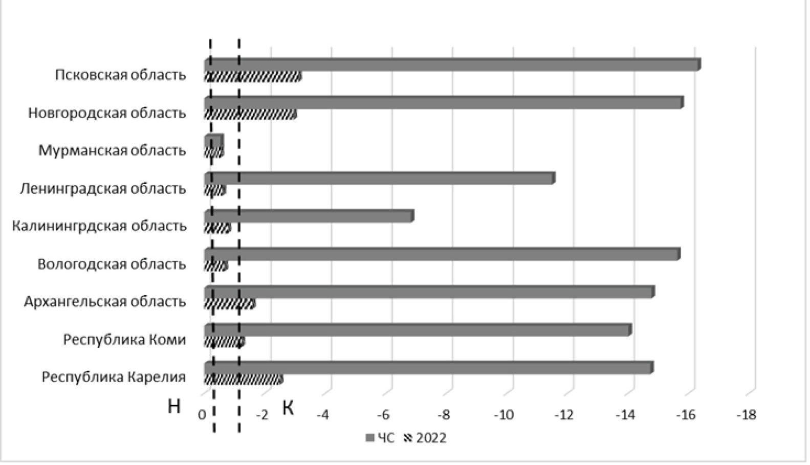 Рис. 2. Интегральная качественная оценка состояния ЭБ регионов Северо-Западного федерального округа с учетом пиковых ПХГ.