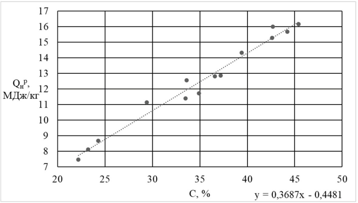 Рис. 1. Зависимость низшей теплоты сгорания от содержания углерода в БУ.