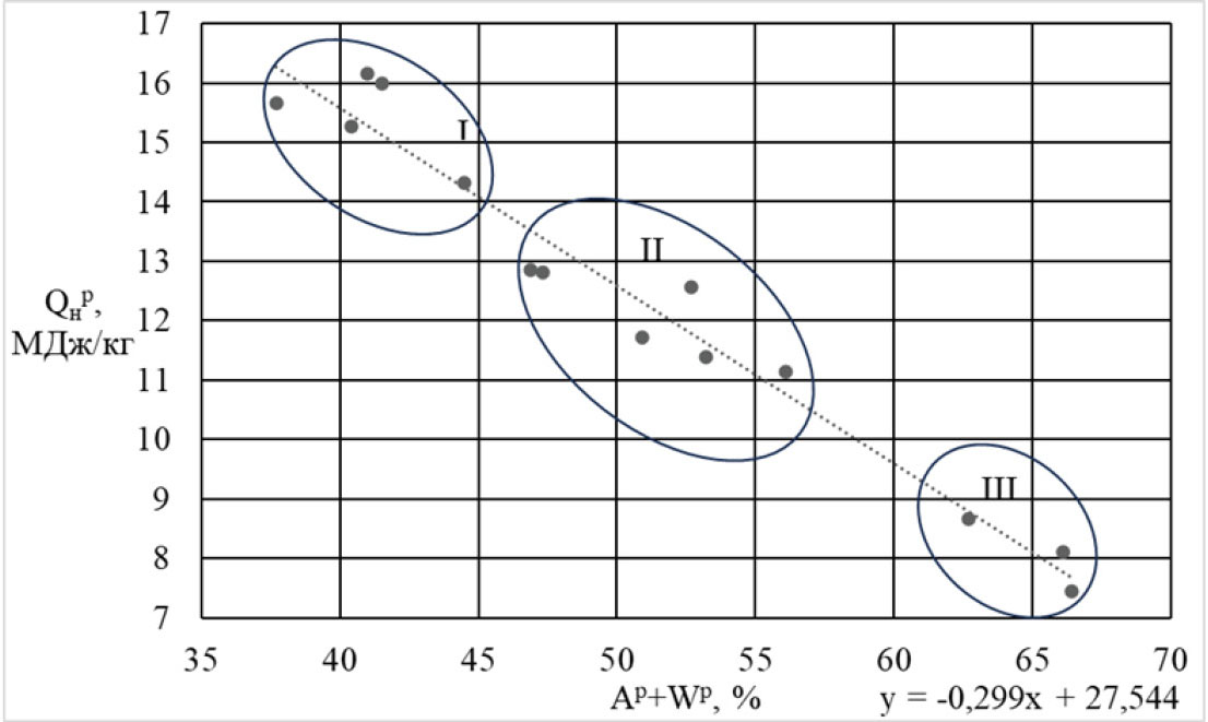 Рис. 2. Зависимость низшей теплоты сгорания от зольности и влажности в БУ.