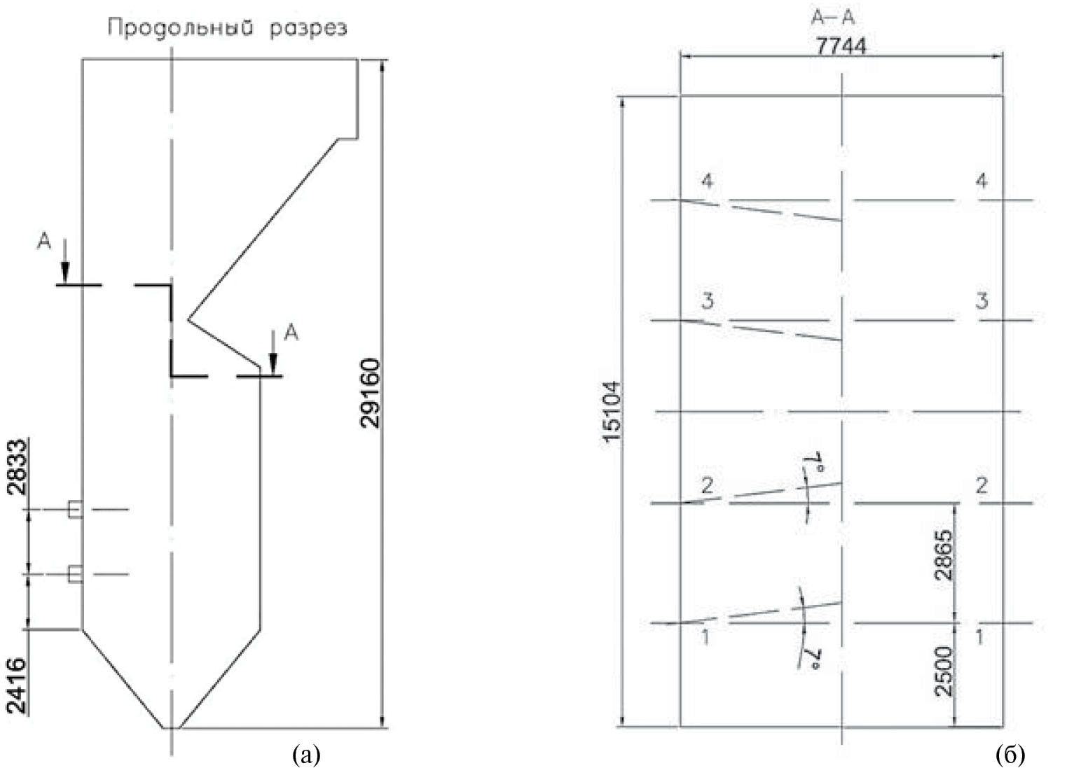Рис. 4. Схема топочной камеры котла БКЗ-420-140-6: а) продольный разрез; б) разрез по А-А; 1-1, 2-2, 3-3, 4-4 – оси расположения вертикальных плоскостей для визуализации.