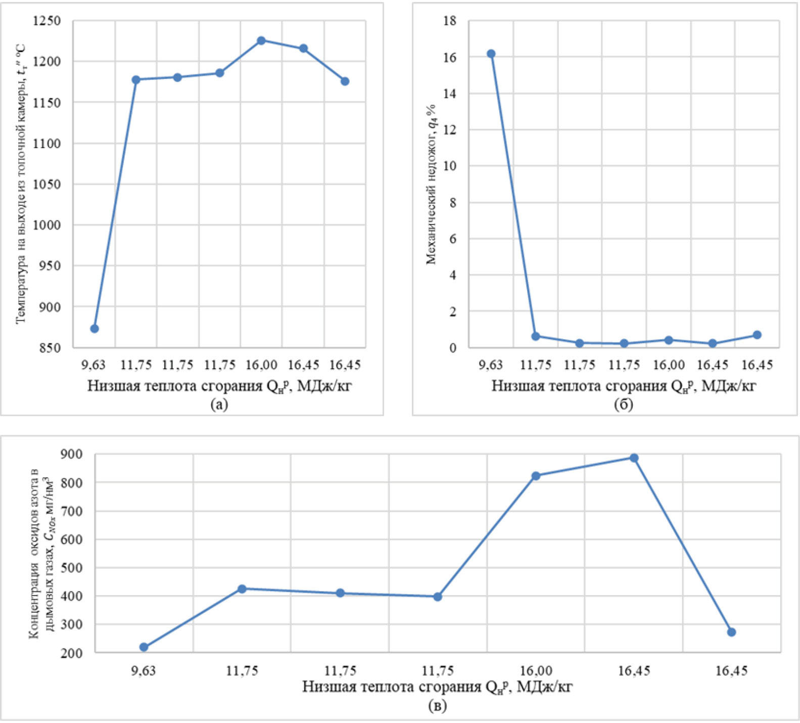 Из полученных результатов (рис. 5а) видно, что влияние низшей теплоты сгорания топлива на температуру газов на выходе из топочной камеры в диапазоне от 11.75 МДж/кг до 16.45 МДж/кг незначительное. Резкое падение температуры в 1.35 раза при увеличении механического недожога более чем в 25 раз наблюдается для варианта № Б2 с низшей теплотой сгорания менее 10 МДж/кг.