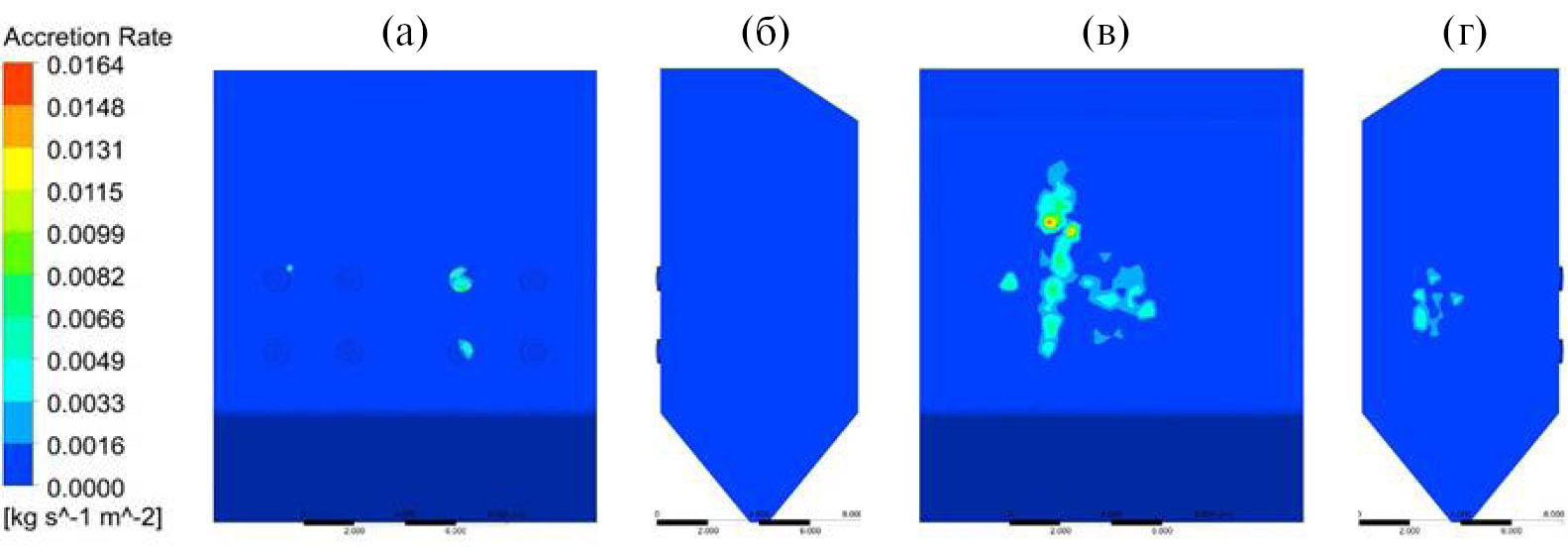 Рис. 6. Интенсивность роста отложений на стенах топочной камеры с вихревыми горелками с топливом № Б3-10% Wр: (а) фронтовая; (б) правая; (в) задняя; (г) левая.
