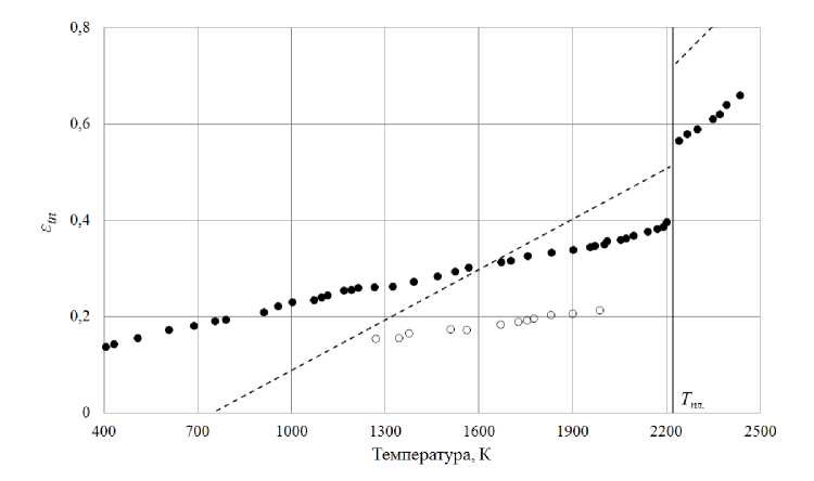 Интенсивность εtn полированного ванадия монотонно увеличивается до температуры 2200 К и совершает бросок ИС относительно твердой фазы состояния на 34% с последующим продолжением увеличения ИС в жидкой фазе до предельных температур опыта (рис. 1).