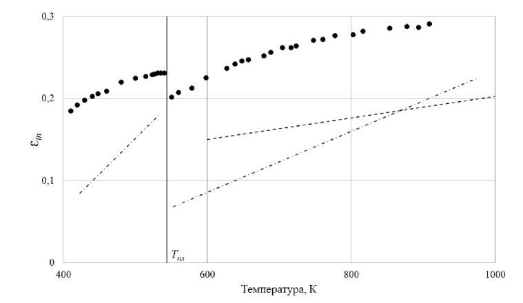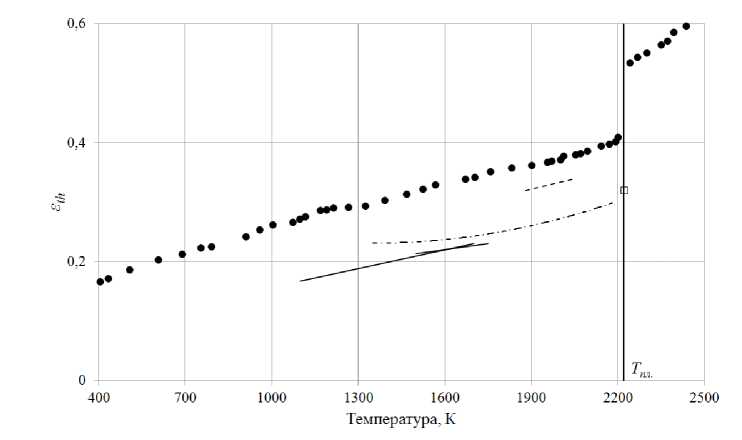 Воронин Л.К. и др. [26] в своей работе экспериментально полученные значения εth ванадия с химической чистотой 99.82% аппроксимировал двумя прямыми линиями с пересечением в точке 1600 К и рекомендовал к использованию выражения следующего вида