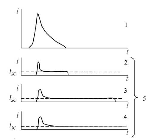 Рис. 1. Классификация ВДР по продолжительности разряда [22]: 1 – первичный разряд; 2 – неустойчивая дуга (NSA); 3 – временная устойчивая дуга (TSA); 4 – постоянная устойчивая дуга (PSA); 5 – вторичные дуги.