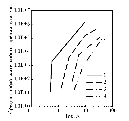 Рис. 2. Средняя продолжительность горения дуги для различных металлов: 1 – цинк; 2 – серебро; 3 – медь; 4 – вольфрам [18].