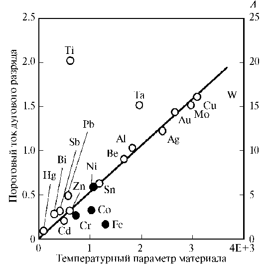 Рис. 3. Пороговые токи дугового разряда для различных материалов катода от температурного параметра материала . Зачерненными кружками отмечены результаты измерений для ферромагнитных металлов и кобальта. Ось ординат для них указана справа [19].