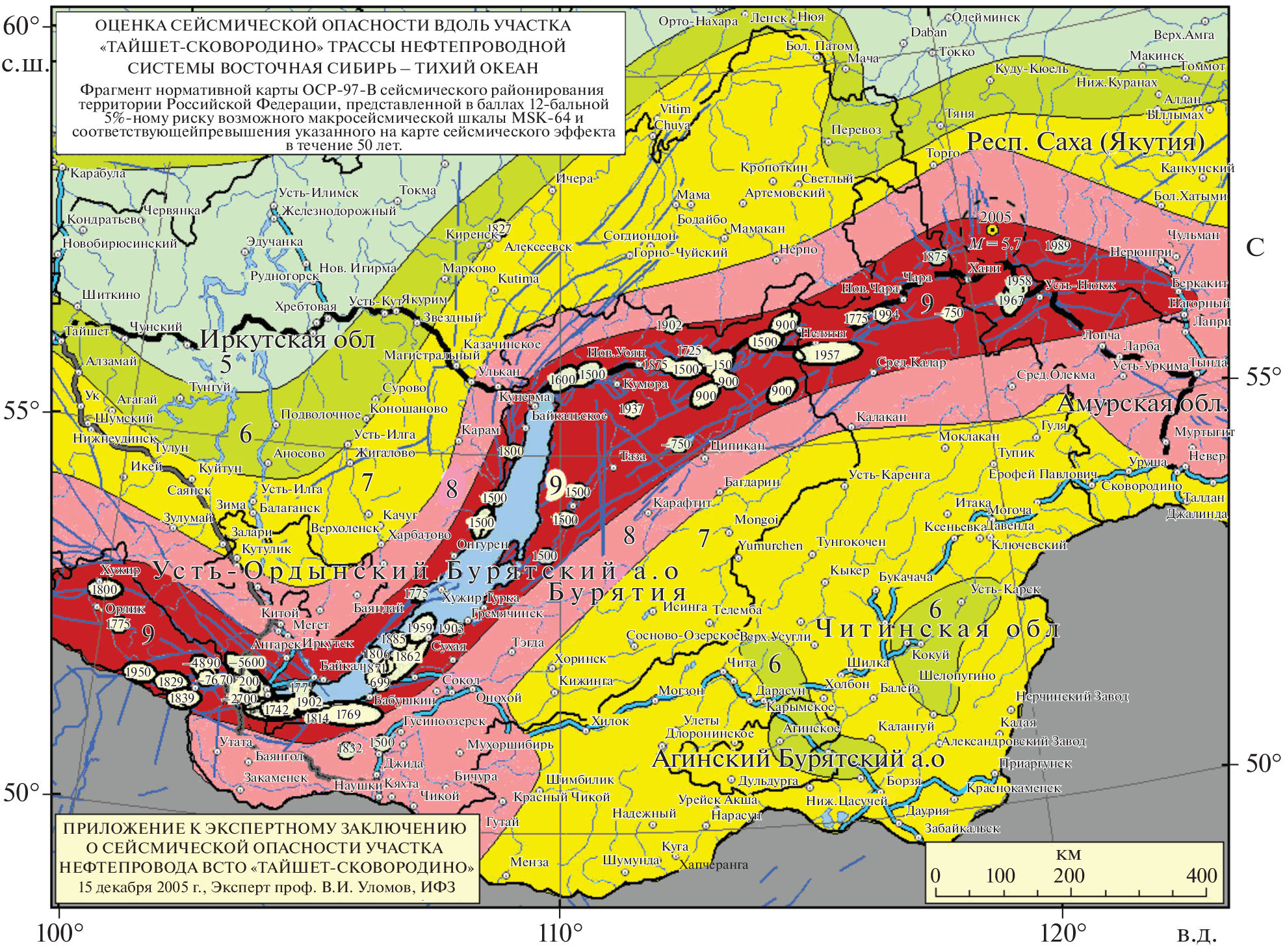- Уломов В.И. Заключение эксперта В.И. Уломова, доктора физико-математических наук, профессора геофизики, члена экспертной комиссии Государственной экологической экспертизы материалов по обоснованию строительства “Трубопроводной системы первого пускового комплекса Восточная Сибирь–Тихий океан (ВСТО)” /ТЭО (проект)/по оценке сейсмической опасности О сейсмической опасности участка трассы нефтепровода ВСТО "Тайшет-Сковородино”. 2005. http://seismos-u.ifz.ru/personal/control.htm