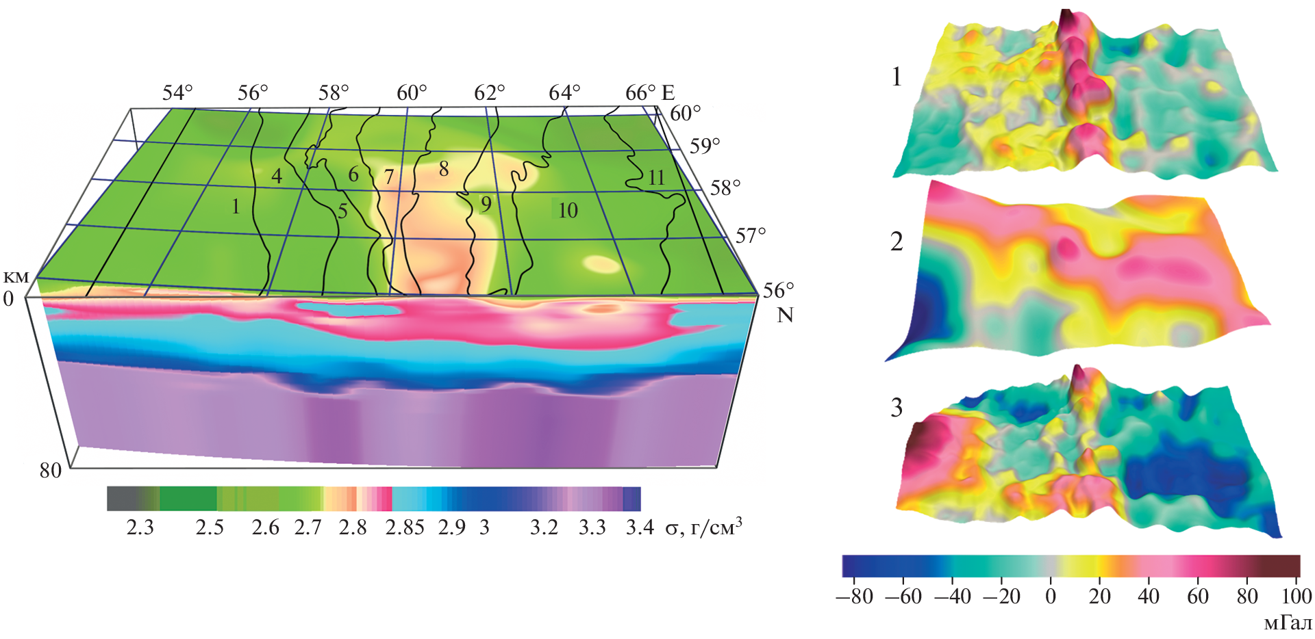 For the Middle and North Urals segments and adjacent territories of the East European Platform and West Siberian Plate (within the graticular trapezoid with geographic coordinates 53–65° N, 48–72° E), ten deep seismic sounding (DSS) profiles were reprocessed using two-dimensional (2D) seismic tomography method, and gradient sections of crustal velocities were constructed in the form of grid functions. In the same format, density sections were constructed. The coefficients of density–velocity empirical correlation were calculated using the solution algorithm of 2D inverse problem of gravimetry. The method and calculation technology of a three-dimensional (3D) density distribution with tying to 2D data from reference seismic sections are embedded in the procedure of quantitative interpretation of potential fields with construction of 3D geophysical models. A stable solution of the 3D inverse problem of gravimetry is sought on the correctness set of the family of horizontal layers with 2D density distribution.