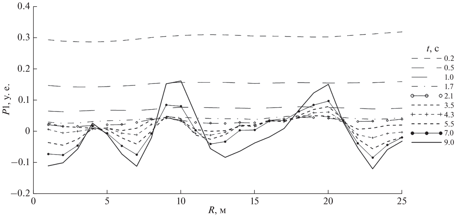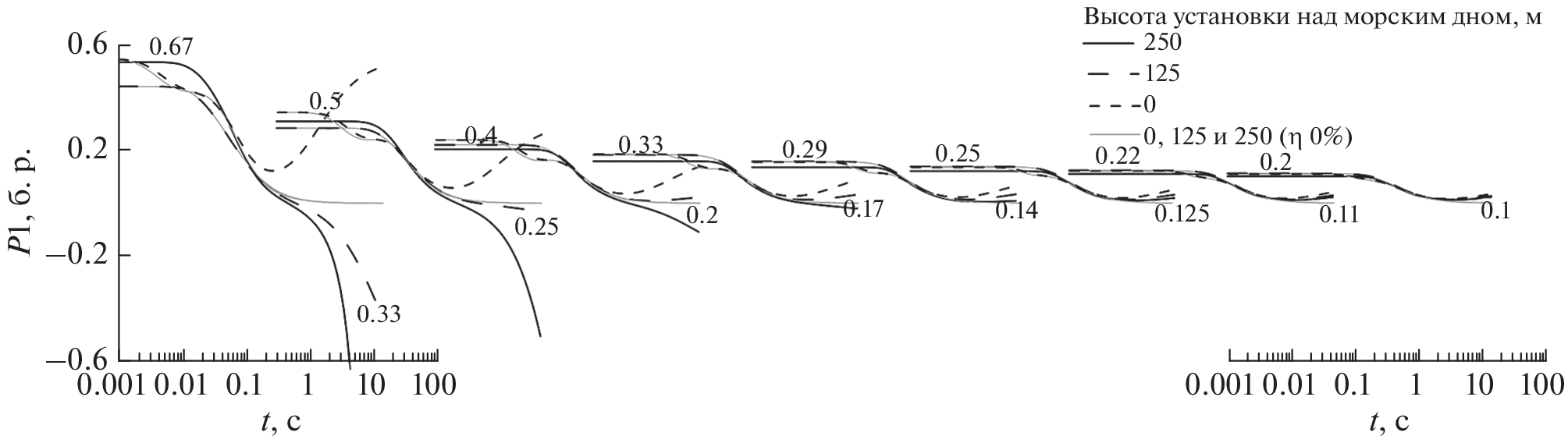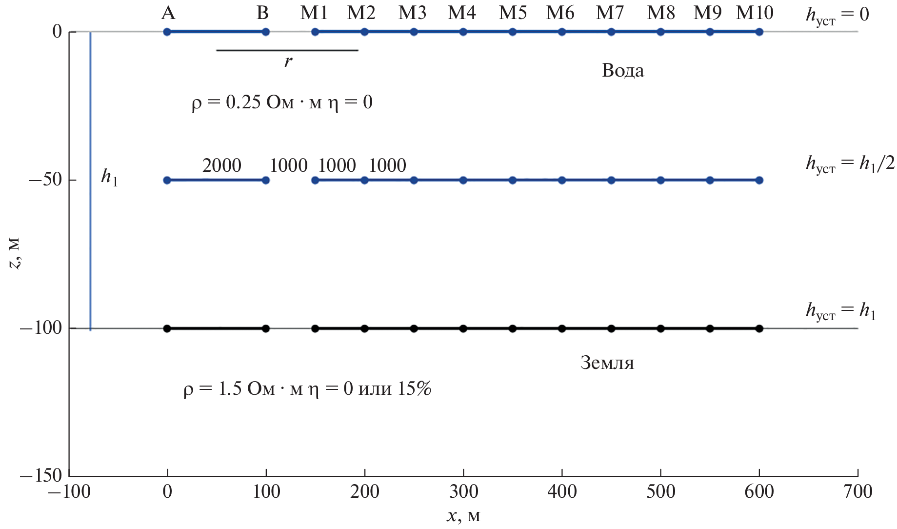 A change in the non-stationary electromagnetic (EM) signal over the conducting polarizable Earth covered by sea water on measuring lines located in the axial and equatorial regions of the source – a pulsed horizontal electric line (HEL) – is considered. When the HEL operates under pulsed conditions, it creates a galvanic and eddy current in the medium. If the medium affected by the HEL is heterogeneous, both influences lead to the separation of bound charges. After attenuating the impact of an artificial source, relaxation (depolarizing) processes of various nature appear in such a medium, manifesting themselves, in particular, in the form of an EM signal. As a result, the transient process recorded by the grounded line after the pulsed effect of the HEL is at least a superposition of three components: the transient electromagnetic (TEM) signals, galvanically induced polarization (GIP) and inductively induced polarization (IIP). As the contribution of the TEM field component to the overall signal decreases, the IP signal is manifested in the transient process by a change in the time response of the decay, to the point where the signal reverses polarity. As shown earlier by numerical simulations for the axial region of the HEL, the manifestation of the IIP signal at late transient process times, for most of the geoelectric conditions on land, is invisible against the GIP manifestation (Ageenkov et al., 2020). These calculations also show that in the axial region, the GIP signal manifests itself in the form of a deceleration of the transient process rate, and the IDP signal – an acceleration of the decay rate, to the point where the signal changes its sign. Field measurements performed by the aquatic differential-normalized method of electrical prospecting (ADNME), which uses axial electrical installations, record transient processes with a change in the time response of the decay: it becomes more delayed or, vice versa, runs faster and may be accompanied by a change in the polarity of the signal. In other words, measured signals of different forms are observed, which are presumably associated with the manifestation of the GIP or IIP signals. The relevance of the publication lies in the need to explain the results of field measurements performed offshore, to understand the relationship between the course of the transient process and the geoelectric conditions existing in the water area. And in general, to describe the formation of the transient response of the medium in the axial and equatorial region of the HEL for the conditions of aquatic geoelectrics. The calculated signal for axial and equatorial electrical installations with several spacings under the conditions of the sea shelf water area is studied when the installation is located on the surface of and inside the water layer, and on the seabed of the water area – on geological formations. For axial installations, calculations are made of the quantities used in the ADNME: the transient process ΔU(t), the finite difference of the transient process Δ2U(t) and the transformant P1(t) – the ratio of Δ2U(t) to ΔU(t). For equatorial installations, the signal ΔU(t). is calculated. The signals of a two-layered model of the medium with polarizable and non-polarizable bases are compared.