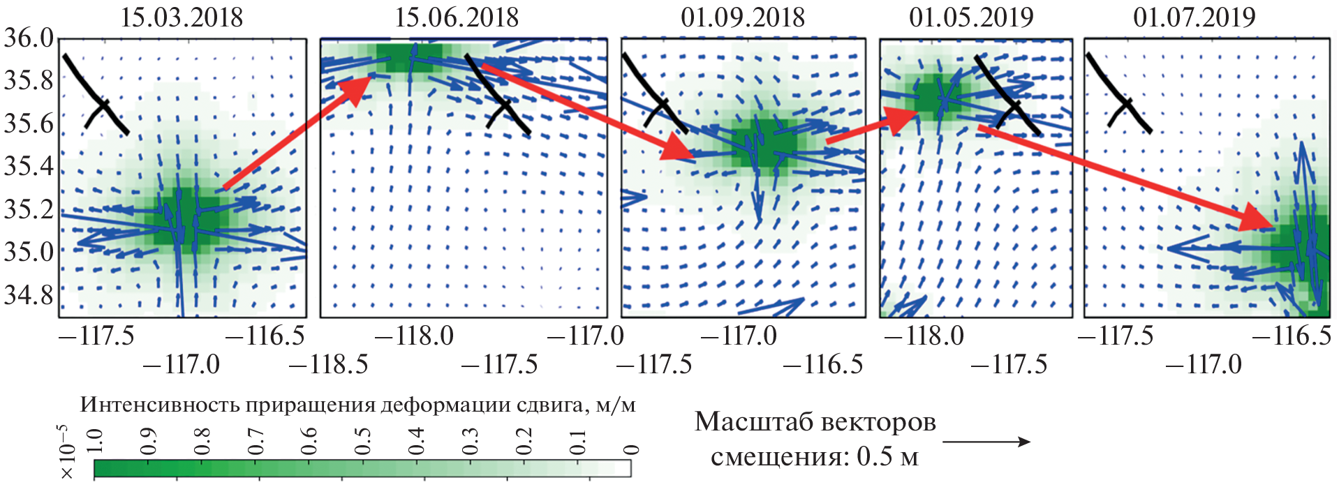 Миграция аномальных смещений на флангах формирующегося очага – модель “качели”