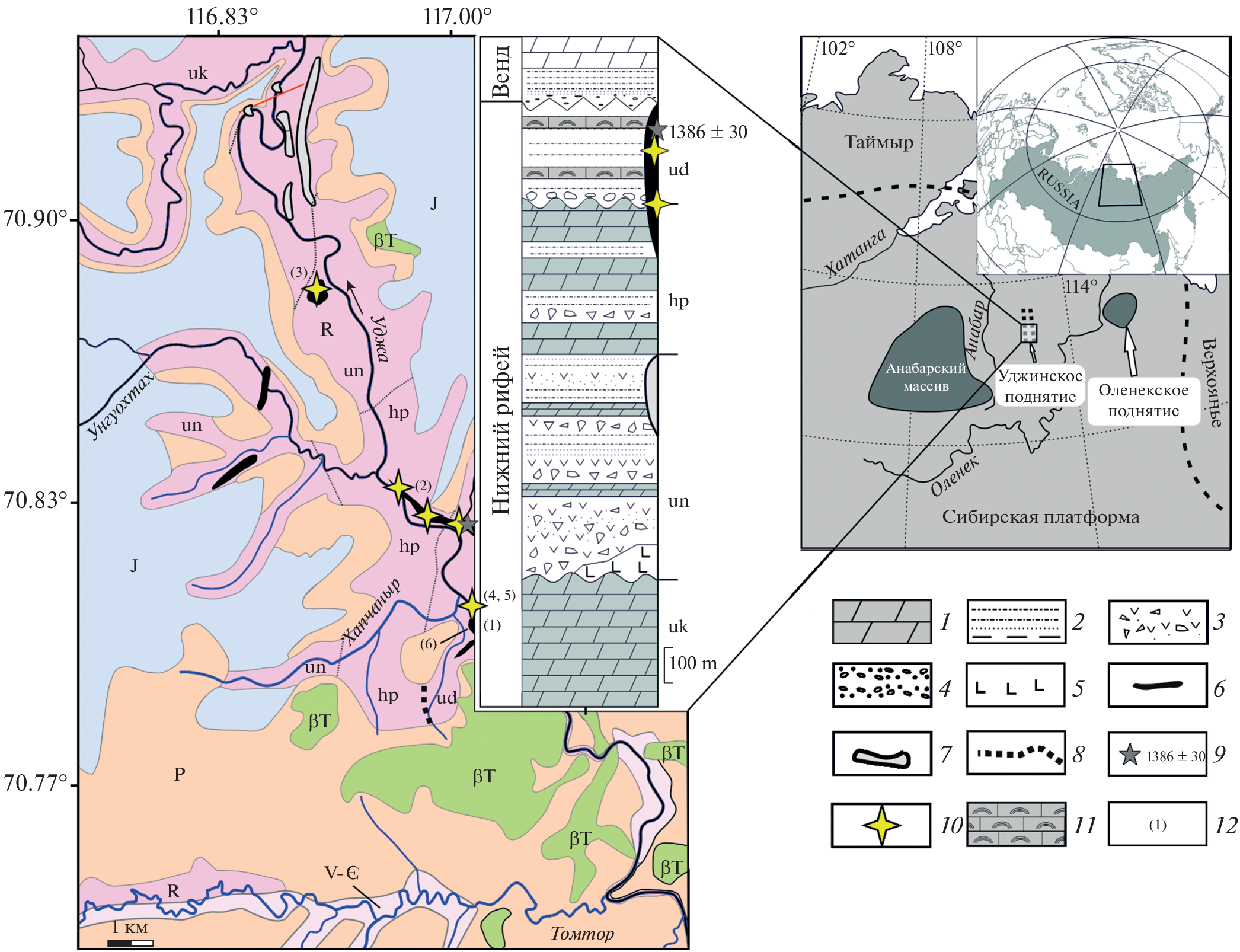 - Ernst R.E., Buchan K.L., Hamilton M.A., Okrugin A.V., Tomshin M.D. Integrated paleomagnetism and U-Pb geochronology of mafic dikes of the eastern Anabar Shield region, Siberia: Implications for Mesoproterozoic paleolatitude of Siberia and comparison with Laurentia // The J. Geology. 2000. V. 108. № 4. P. 381–401. https://doi.org/10.1086/314413