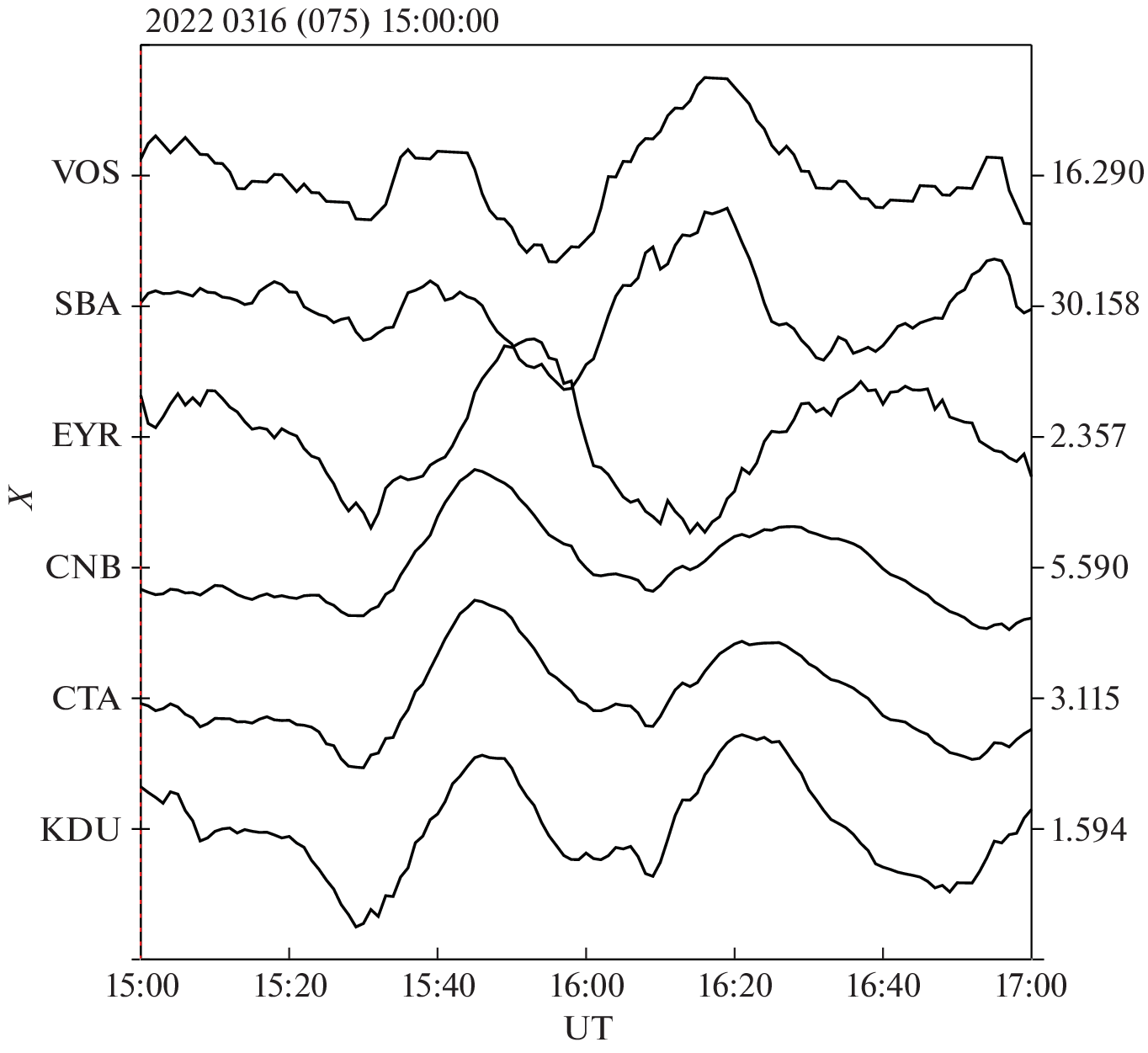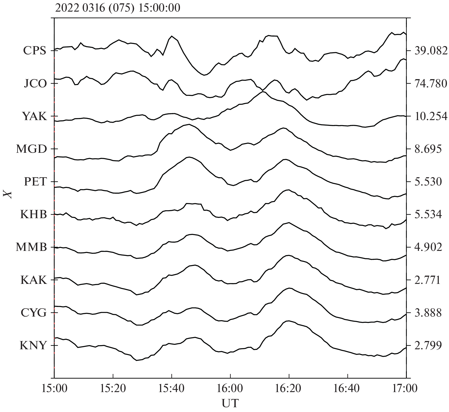 —The magnetic effects of two similar underwater earthquakes with magnitudes of 6.0 and 7.3, which occurred on March 16, 2022, were considered in [Adushkin et al., 2023]. According to the data of INTERMAGNET magnetic observatories, these earthquakes were found to be accompanied (with a delay of ~55 min) by variations in the Earth’s magnetic field in the form of a train of quasi-periodic oscillations with an amplitude of ~2–8 nT and a period of ~30 min at distances of ~210 to ~3000 km from the epicenter. It was suggested in the aforementioned study that this magnetic effect is caused by a perturbation of the geodynamo as a result of the impact of seismic waves propagating deep into Earth. This interesting hypothesis requires a detailed discussion from different points of view. A more detailed analysis of the pattern of geomagnetic field perturbation at all latitudes, performed by us, leads to a conclusion that the found quasi-periodic perturbation is a mid-latitude response to auroral electrojet variations and is not related to the earthquake. According to our estimates, variations with a source at the core–mantle interface on a time scale less than 1 year cannot manifest themselves on the Earth’s surface at all.
