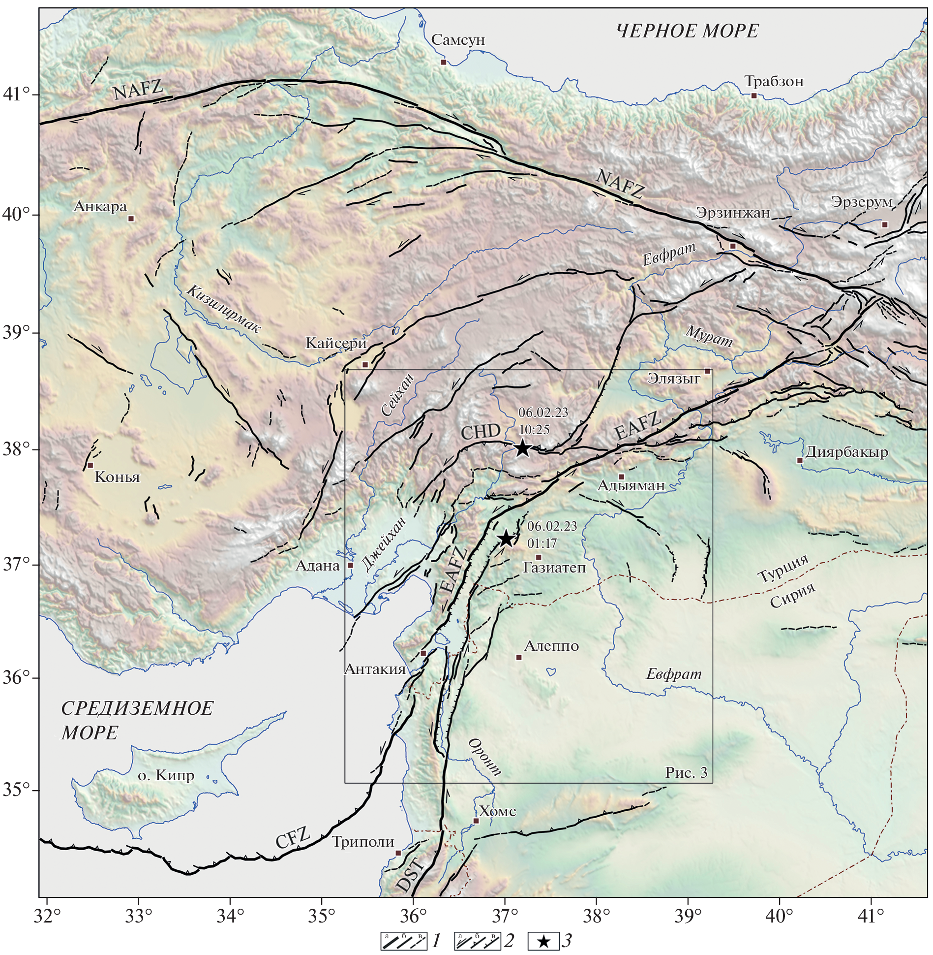 —During the East Anatolian earthquake with Mw = 7.8, which occurred on February 6, 2023 at 1:17 UTC, the 361 km long segment of the NE-trending East Anatolian active left-lateral fault zone (EAFZ) was activated. A left-lateral displacement took place at a distance of 318 km on formed seismic ruptures. Its maximum magnitude of 8.5 m is registered northward of the earthquake epicenter. To the northeast, the displacement of several meters is maintained over a significant length of the activated segment and is accompanied by uplift of the south-eastern side of the ruptured zone at up to 1.5 m. To the southwest of the maximum displacement area, the strike slip decreases from it at shorter distances compared to the northeastern part and the vertical component varies, although the southeastern side is mostly uplifted. In the terminal southwest, the strike slip is replaced by normal faults, gaping fractures, and other manifestations of transverse extension, which are accompanied by landslides and are mainly secondary seismic dislocations. Left lateral slip also occurred at the northern ends of the western and eastern branches of the Dead Sea Transform (DST), adjacent to the EAFZ from the south. Despite the fact that the energy distribution of numerous aftershocks along the EAFZ is generally proportional to the distribution of offsets on seismic ruptures, the slip on the EAFZ occurred during and immediately after the main shock. In the northern part of the DST, a significant decrease in the amount of energy released by strong earthquakes during the last centuries has been established. We consider that the tectonic stress accumulated in the northern part of the DST became the important geodynamic source of the East Anatolian 02.06.2023 earthquake.