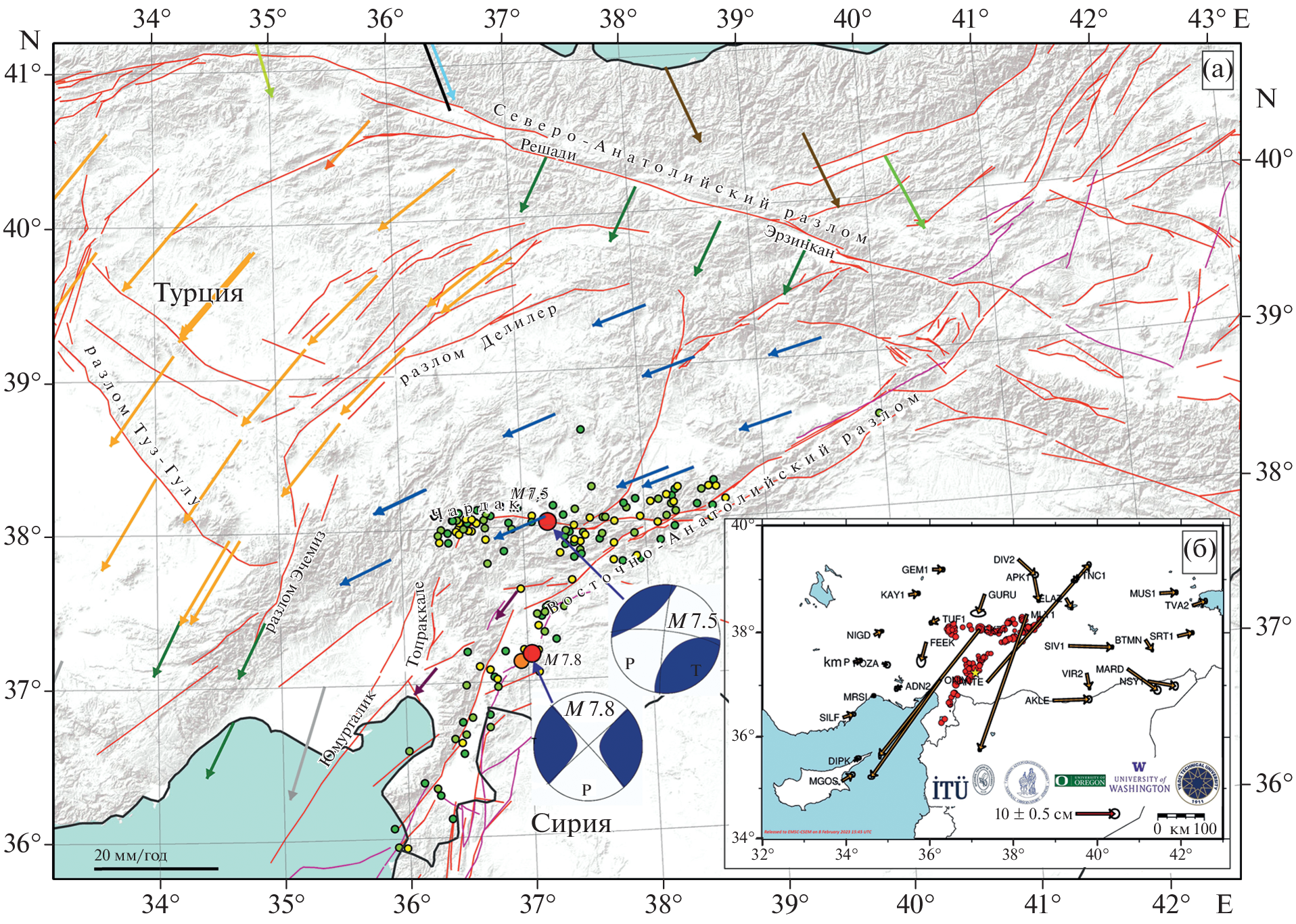—In this paper, we carried out a kinematic analysis of the movements of plates and blocks of the region based on a homogeneous database of displacement velocities of GNSS permanent monitoring stations for the region of southeastern Turkey, where strong earthquakes occurred on February 6, 2023. Along the East Anatolian fault zone from 2008 to 2018, the Arabian Plate was established to shift relative to the Anatolian Plate, corresponding to a left shift (without a normal component) at a rate of 1 cm/yr in the eastern part to 0.8 cm/yr in the western part. Displacements occurred along the Chardak fault, corresponding to a left-hand strike-slip fault, at a rate of less than 0.7 cm/year. The revealed kinematics is confirmed by focal mechanisms and cosesismic displacements of the studied earthquakes. The M7.5 earthquake that occurred directly on the Chardak fault is not an aftershock of the M7.8 earthquake, but is a relatively independent event. An analysis of the seismic regime shows that the stresses on the East Anatolian fault after the main event M7.8 are relieved by the first large latitudinal fault zone (the Chardak fault). The results of our study suggest that the counterclockwise rotation of the Anatolian and Arabian plates associated with the opening of the Red Sea Rift is most likely decisive for the general kinematics of the plates in the region.