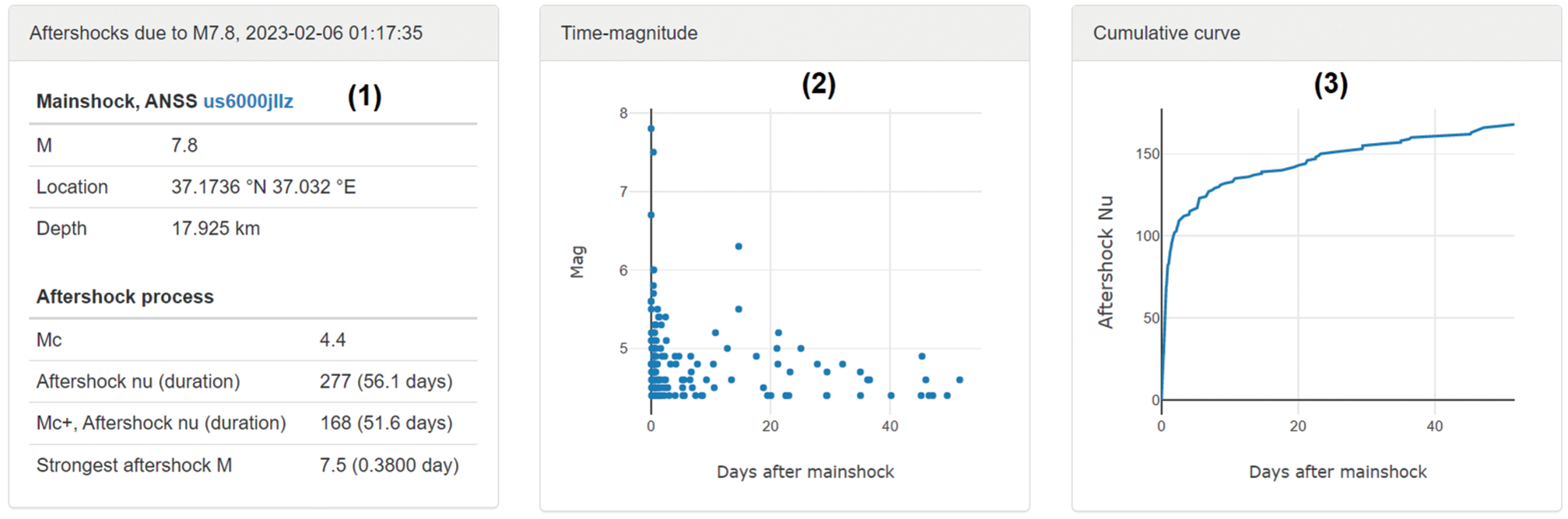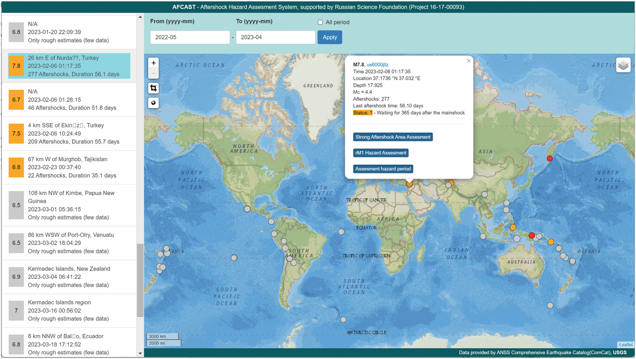 Abstract—This paper analyzes the use of the automated aftershock hazards assessment system (AFCAST) through the example of a series of aftershocks of the Mw 7.8 earthquake in Turkey of February 6, 2023 (the Pazarcik earthquake). The paper presents automated estimates of the aftershock activity area, the magnitude of the strongest aftershock, and the duration of the hazardous period, yielded using data on the main shock and on the first aftershocks.