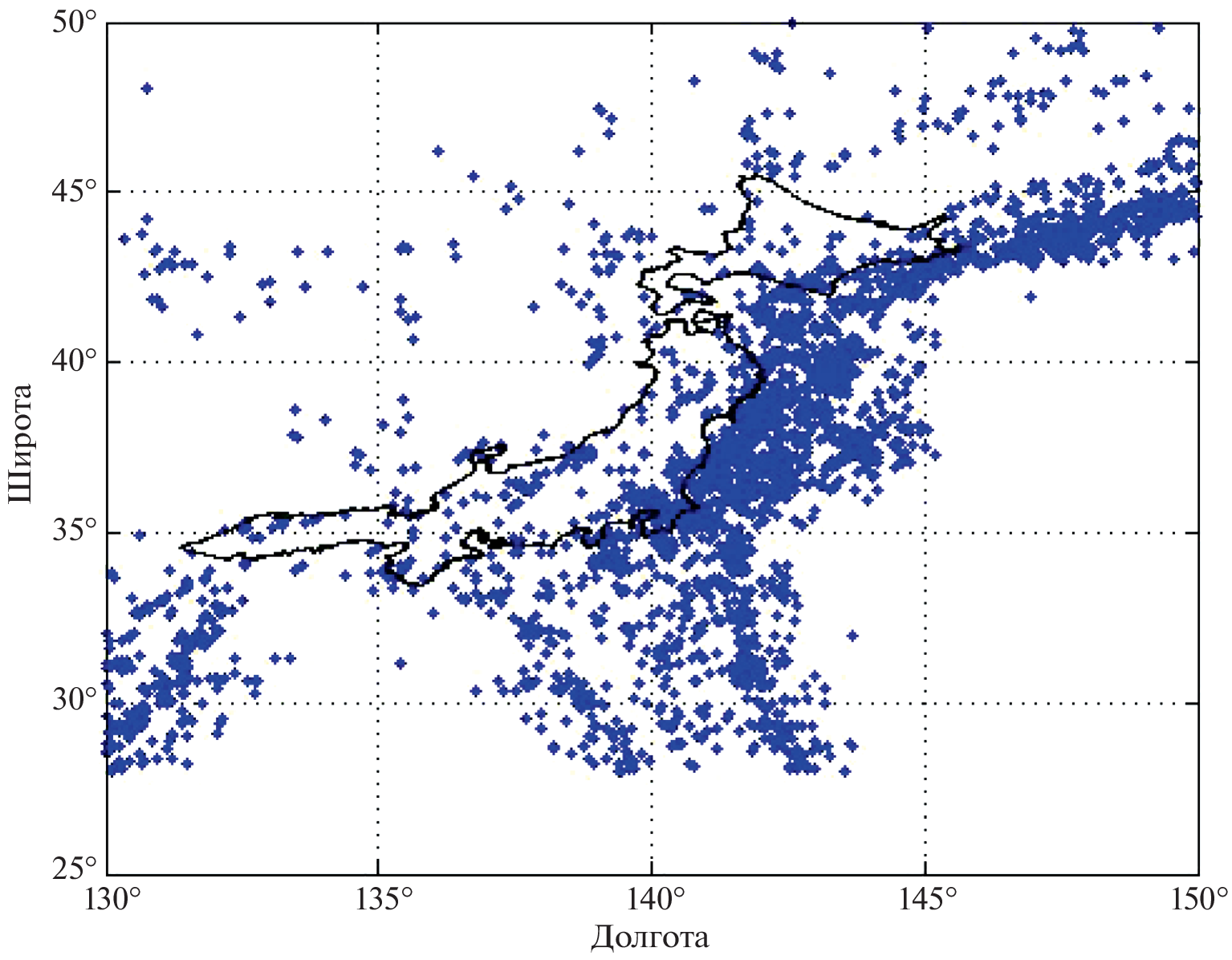 —This study is devoted to application of some new statistical methods to analysis of the spatial struc-ture of the seismic field in the seismically active region in the Japan region bounded by the following coordinates: 28°–50° north latitude, 130°–150° east longitude. The estimates of the seismic flux by using the k nearest neighbors method for the magnitude interval m ≥ 5.2. The highest values of intensity of about 10–4 \(\frac{1}{{{\text{year}}{\kern 1pt} - {\kern 1pt} {\text{k}}{{{\text{m}}}^{{\text{2}}}}}}\) are located at depths of down to 100 km and manifest themselves in the neighborhood of the Tohoku megathrust earthquake. The spatial resolution of the intensity estimates is ranging from 33–50 km in the regions with a high intensity to 100 км and larger in the zones of weak intensity. It has been shown that the seismic filed parameters – intensity λ, slope of the graph of repetition β, maximum possible magnitude m1 – have different scales of their spatial variability and, thus, it is necessary to apply different scales of spatial averaging to them. Based on the Gutenberg—Richter truncated distribution model, the estimates are obtained for the slope of the graph of repetition (b-value) and the upper boundary of the distribution m1. An original method is proposed for determining the optimal averaging radius for an arbitrary cell of the space grid. The method is based on the use of the statistical coefficient of variation of the corresponding parameter. For the considered region, the estimate of the maximum possible magnitude Мmax = 9.60 ± 0.41 was obtained with consideration of the correction for bias.