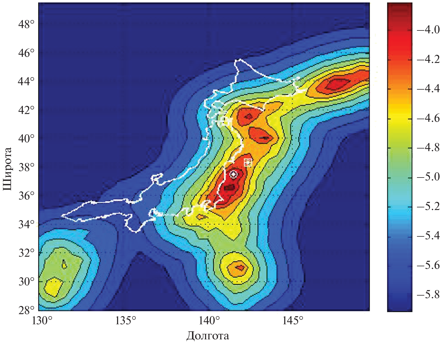 Настоящая работа посвящена применению некоторых новых статистических методов к анализу пространственной структуры сейсмического поля в высокосейсмичном регионе в окрестности Японии, ограниченном координатами: широта 28°–50° N; долгота 130–150° E. Получены оценки поля интенсивности сейсмического потока по методу k-ближайших соседей для диапазона магнитуд m ≥ 5.2. Наиболее высокие значения интенсивности порядка 10–4 \(\frac{1}{{{\text{{\cyrg}{\cyro}{\cyrd}}}{\kern 1pt} - {\kern 1pt} {\text{{\cyrk}}}{{{\text{{\cyrm}}}}^{{\text{2}}}}}}\) сосредоточены на глубинах до 100 км и проявляются в окрестности мегаземлетрясения Тохоку. Пространственное разрешение оценок интенсивности колеблется от 33–50 км на участках с высокой интенсивностью до 100 км и более в зонах слабой интенсивности. Показано, что параметры сейсмического поля – интенсивность λ, наклон графика повторяемости β, наибольшая возможная магнитуда m1 – имеют разные масштабы пространственной изменчивости и, соответственно, к ним должны применяться разные масштабы пространственного осреднения. На основе модели усеченного распределения Гутенберга–Рихтера получены оценки наклона графика повторяемости (b-value) и верхней границы распределения m1. Предложен оригинальный метод определения оптимального радиуса осреднения для произвольной ячейки пространственной сетки. Метод основан на использовании статистического коэффициента вариации соответствующего параметра. Для рассмотренного региона получена оценка максимальной возможной магнитуды с учетом поправки на смещение Мmax = 9.60 \( \pm \) 0.41.