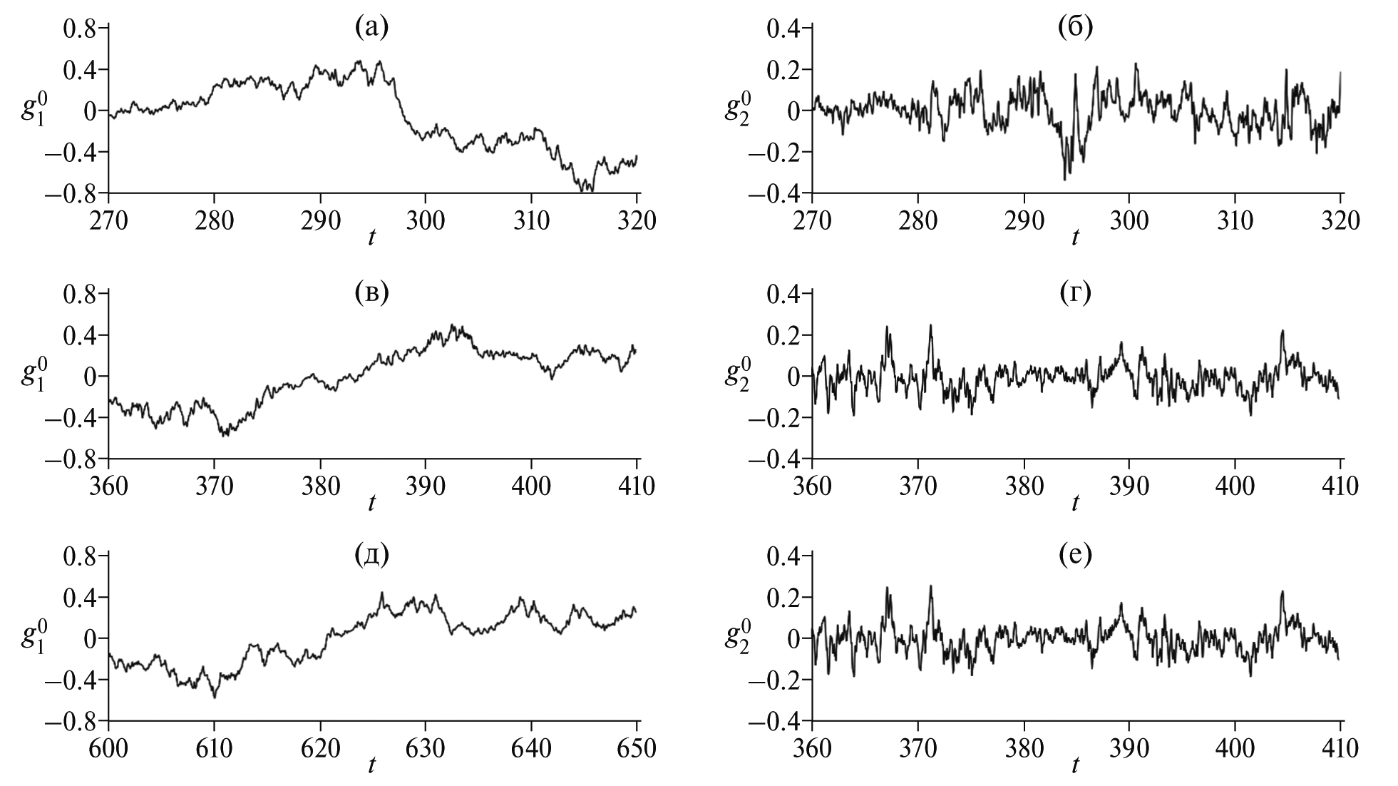 В первом случае, с меньшим перепадом температур между границами, наблюдались три кратковременные смены полярности (1, 2, 3), рис. 1а. Поскольку из анализа поведения угла наклона диполя относительно географической оси еще нельзя заключить о наличии полноценной инверсии, требуется дополнительная информация о напряженности магнитного поля. Для этой цели удобно использовать первый коэффициент в разложении Гаусса представляющий собой вклад осесимметричного диполя в магнитное поле на поверхности жидкого ядра. Анализ рис. 1б свидетельствует, что всплески (1, 2, 3) представляют собой не инверсии, а экскурсы, так как полного восстановления напряженности диполя с обратным знаком не происходило. Не следует забывать, что точность определения по палеомагнитным наблюдениям уменьшается вблизи экватора, в связи с этим, палеомагнитологи определяют экскурс как событие, при котором величина уменьшается в 5–10 раз.