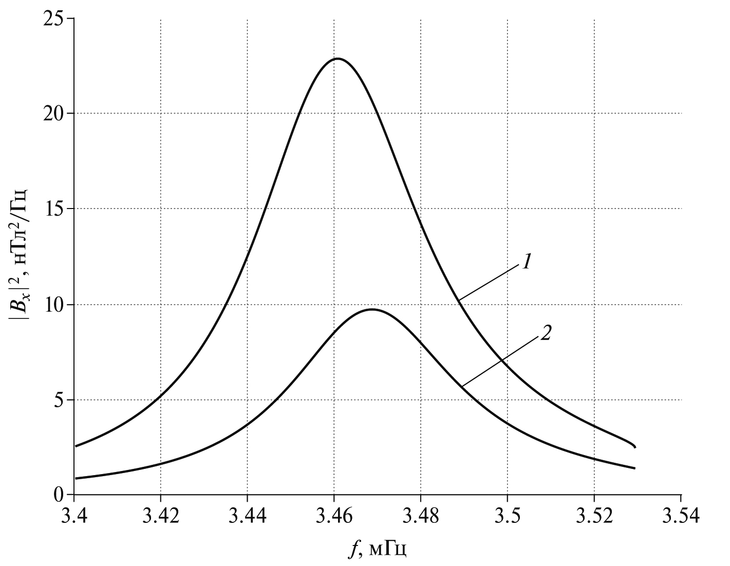 Рис. 2. Модельная зависимость спектральной мощности горизонтальной компоненты ГМВ на земле от частоты. Графики 1 и 2 построены для волновых чисел и км−1.