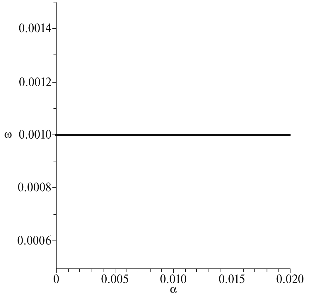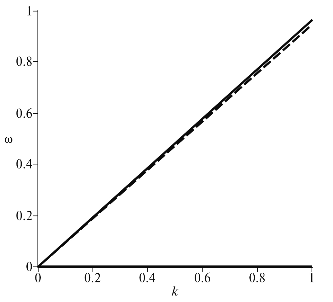 На рис. 2 представлена найденная из характеристического уравнения зависимость от при фиксированном малом значении волнового числа Как видно из этого рисунка, при малых значениях частота очень слабо зависит от этого параметра (верхняя прямая имеет малый наклон).