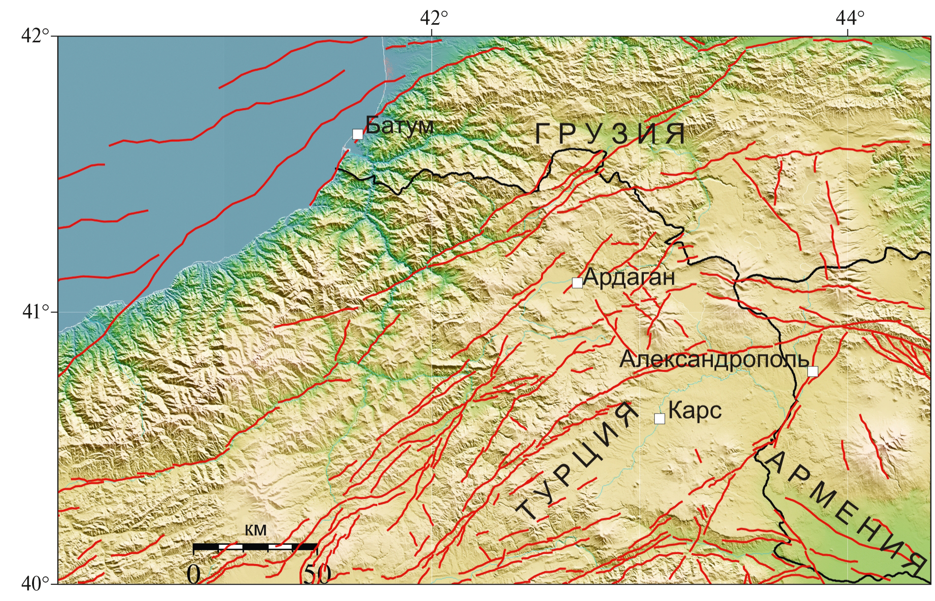 На рис. 1 показана пограничная область современной Турции, Армении и Грузии. Заметим, что активные разломы пересекают границы, пренебрегая государственной принадлежностью территорий. Эти границы существуют с 1991 г. Когда создавался фундаментальный труд “Новый каталог сильных землетрясений на территории СССР с древнейших времен до 1975 г.”. [Кондорская, Шебалин, 1977], дополненный затем до 1988 г. [Shebalin, Leydecker, 1997], существовала только одна граница – между Турцией и СССР (Грузия и Армения входили в состав СССР). Несмотря на то, что часть территории выходила за границы СССР, при создании каталога [Кондорская, Шебалин, 1977] рассматривались землетрясения в рамках рис. 1. Авторы исходили из того, что полноценное понимание сейсмотектоники региона не может быть достигнуто без изучения пограничных районов. Сейсмичность региона изучалась также в рамках международных проектов [Shebalin, Tatevossian, 1997], который также полностью включал территорию в рамках рис. 1.