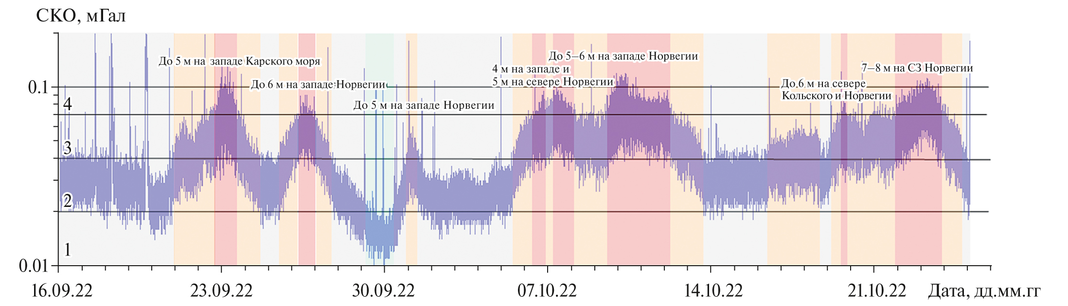 Рис. 3. Измеренное гравиметром СКО, разделенное на группы по интенсивности (горизонтальные черные линии); для 4 группы интенсивности указана высота волн и примерное место штормов.