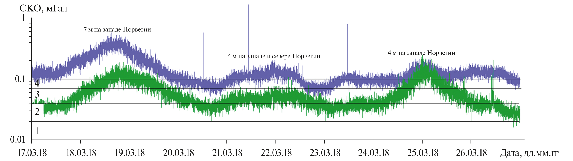 На примере шторма 18.03.2018 г. хорошо видно увеличение уровня зашумленности данных при приближении к эпицентру событий. СКО в Мурманске достигает 0.6 мГал, в то время как в Обнинске этот же шторм вызвал повышение до 0.2 мГал.