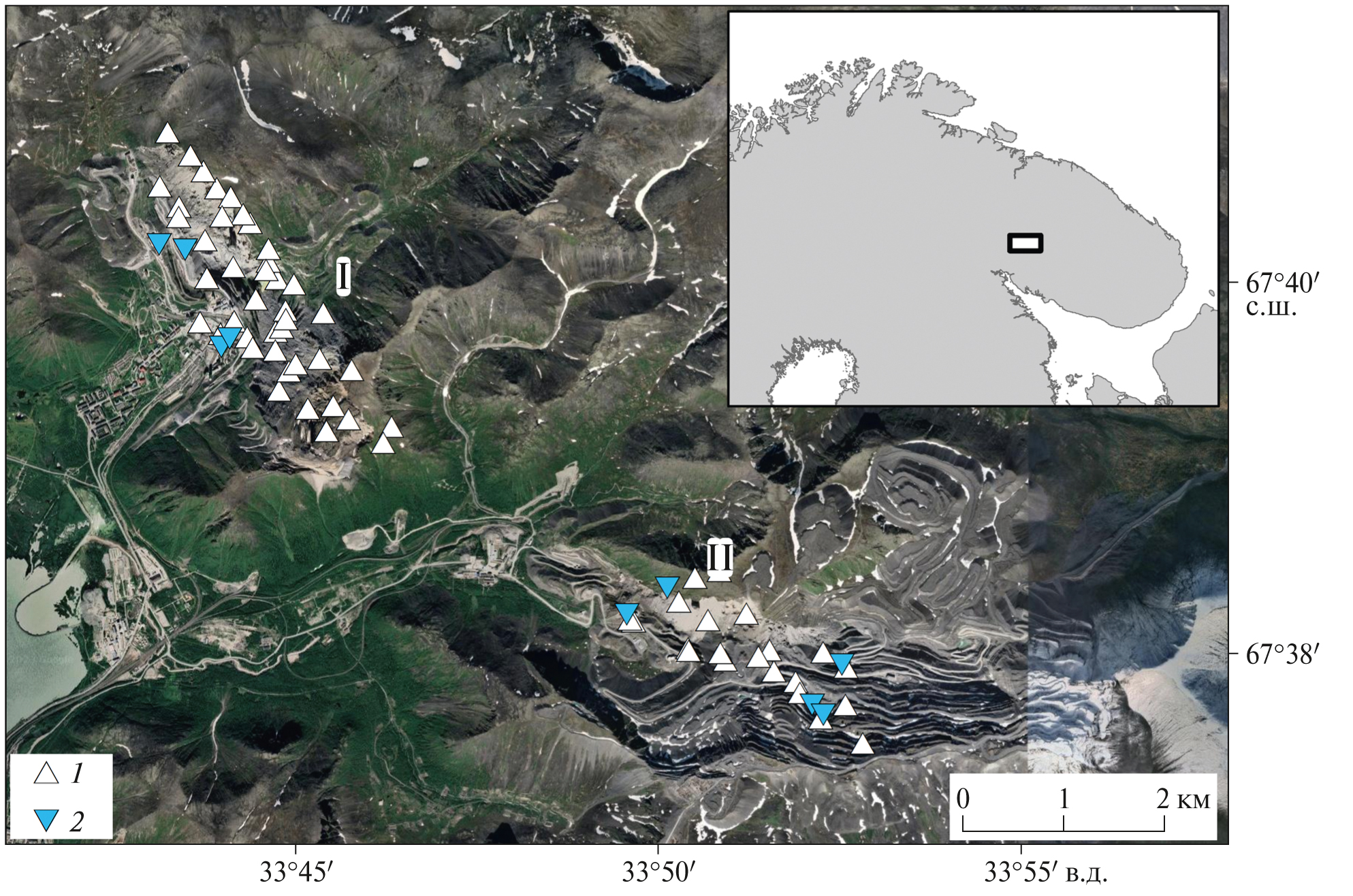 Рис. 2. Местоположение сейсмических датчиков (1) и пунктов замера водопритоков (2). Римскими цифрами показаны территории Кировского (I) и Расвумчоррского (II) рудников. Прямоугольником на вставке обозначено местоположение района исследований.