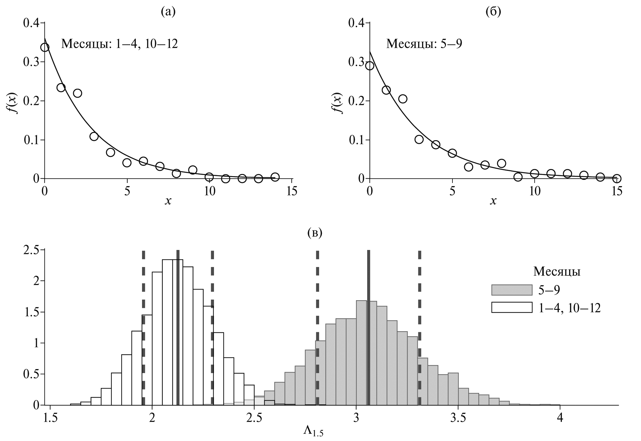 Рис. 7. Распределения продуктивности землетрясений на месторождениях Хибинского массива мае–сентябре (б) и в остальные месяцы года (а): кружки – фактические данные; сплошная линия – плотность экспоненциального распределения; (в) – распределения ошибок оценок параметров Λ1.5, полученные бутстрэп методом: сплошные вертикальные черные линии – значения продуктивности Λ1.5 для соответствующих периодов; пунктирные черные прямые – значение продуктивности Λ1.5 ± σ для соответствующих периодов.