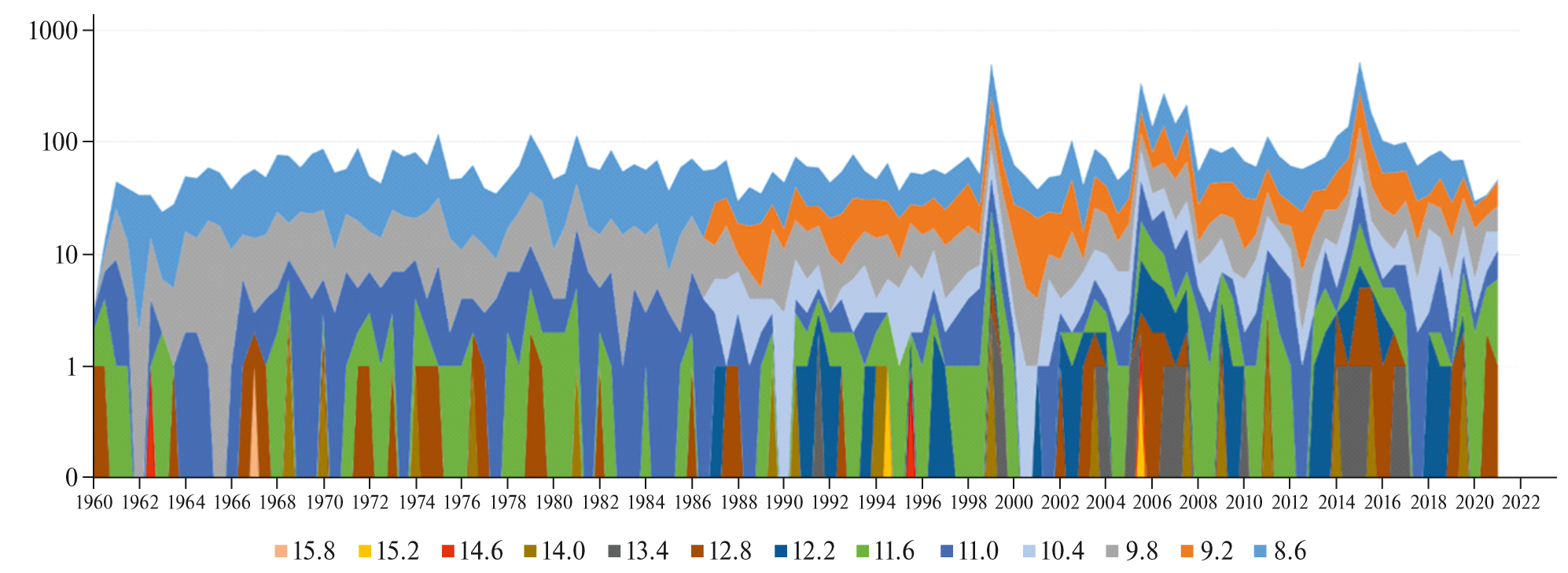 На рис. 1 приведена гистограмма числа событий с энергетическим классом KP ≥ 8.6 для энергетических диапазонов с шагом ∆KР = 0.6 за полугодовые временные интервалы с 01.01.1960 по 31.12.2021 гг. (БФ ЕГС РАН не публикует данные о глубинах зарегистрированных событий, т.к. в пределах регистрации вся сейсмичность характеризуется как коровая.) На рис. 1 видна недостаточная представительность событий с классом менее 9.2 за 2019–2021 гг. (зарегистрированные в этот период сейсмические события находится в обработке). Данные с января 2019 г. нами не использовались. Отметим, что в период до 1986 г. включительно значения энергетического класса сейсмической сетью БФ ЕГС РАН определялись исключительно целыми числами, а с 1987 г. по настоящее время – с точностью до десятых. Изменение в точности определения классов четко видно на рис. 1.