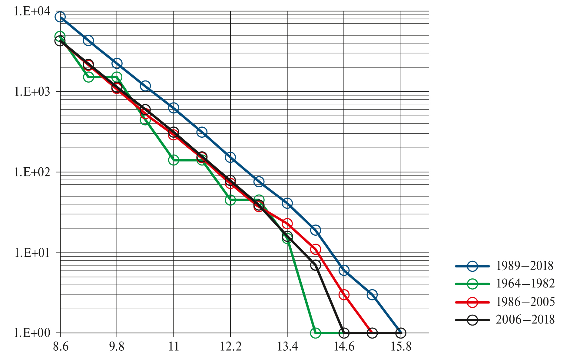 Примечание: данные для шести временных интервалов с 1964 по 2018 гг. для землетрясений с KР = 8.6 и выше.