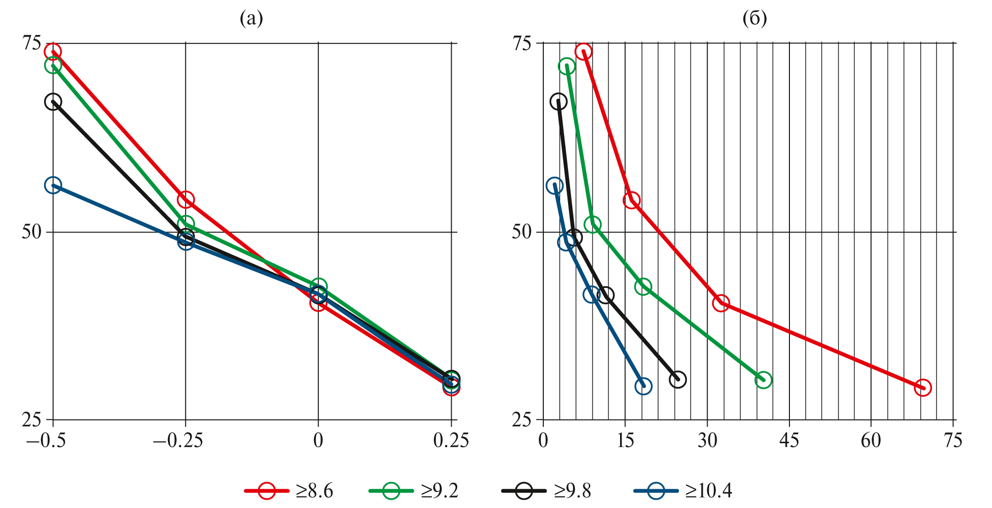 – шести непересекающихся временных интервалов с 1964 по 2018 гг. и сейсмических событий энергетического класса КР ≥ 8.6 при фиксированных параметрах алгоритма DPS.