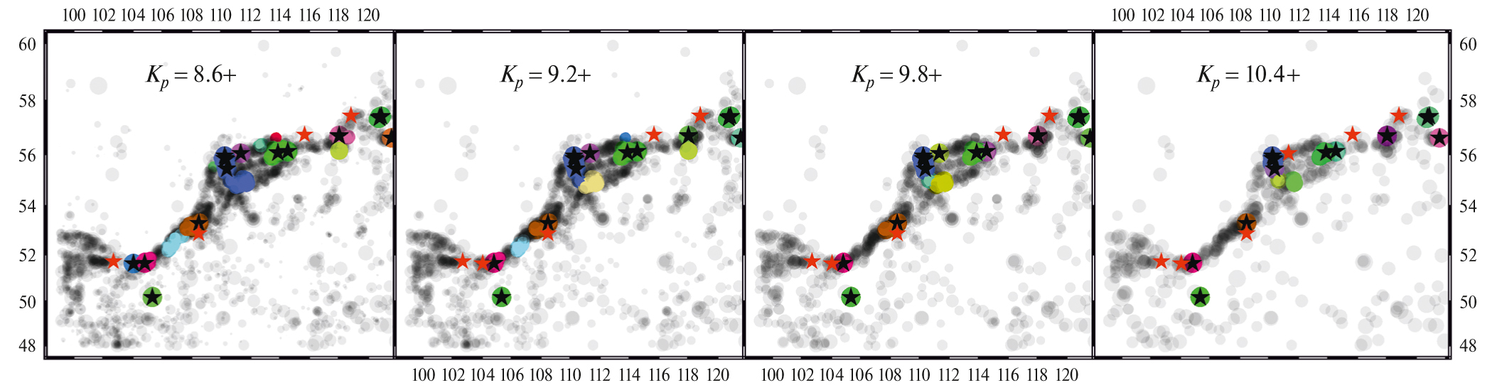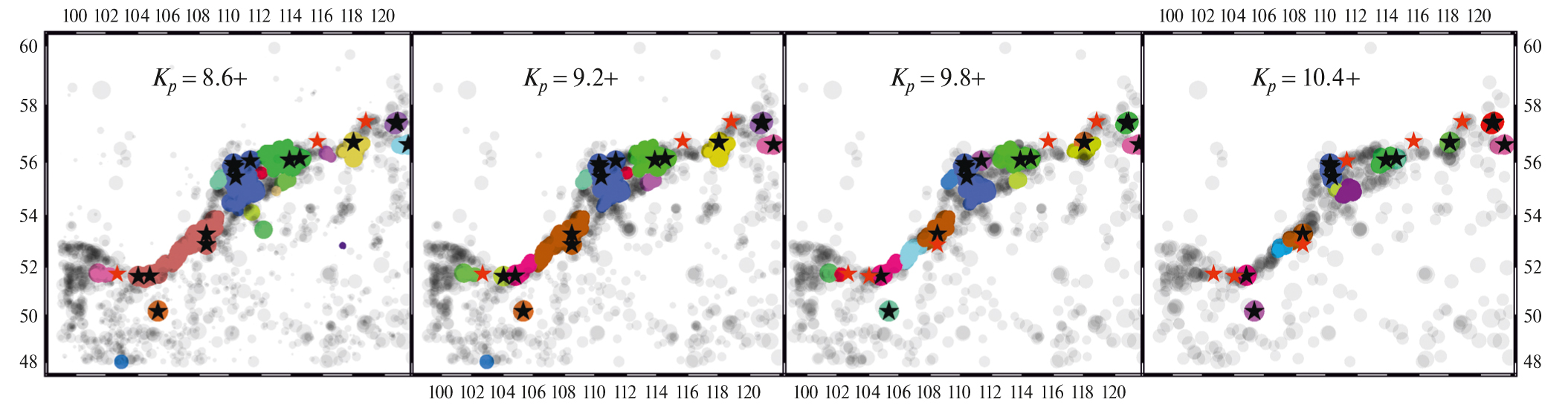 Рис. 4. Пространственное распределение эпицентров землетрясений с KР ≥ 8.6, ≥ 9.2, ≥ 9.8 и ≥ 10.4, объединенных в кластеры алгоритмом DPS: (i) вошедшие в кластеры – цветные символы, (ii) не вошедшие в кластеры – символы серого цвета. Эпицентры землетрясений с KР = 14 и больше, вошедшие в кластеры, показаны черными звездочками; не вошедшие в кластеры – красными звездочками. Примечание: данные с 1989 по 2018 гг. Параметры алгоритма DPS: q = –2, β = –0.5.